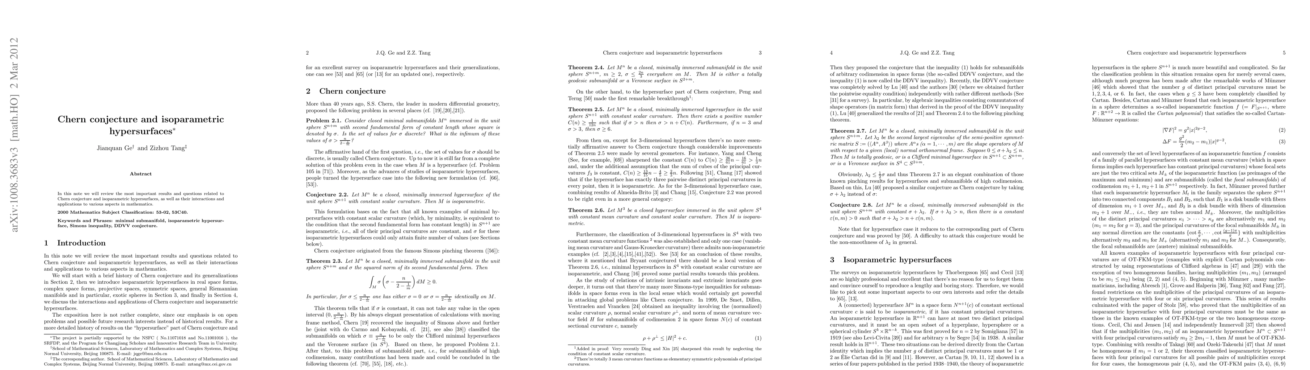In this note we will review the most important results and questions related to Chern conjecture and isoparametric hypersurfaces, as well as their interactions and applications to various aspects in mathematics.