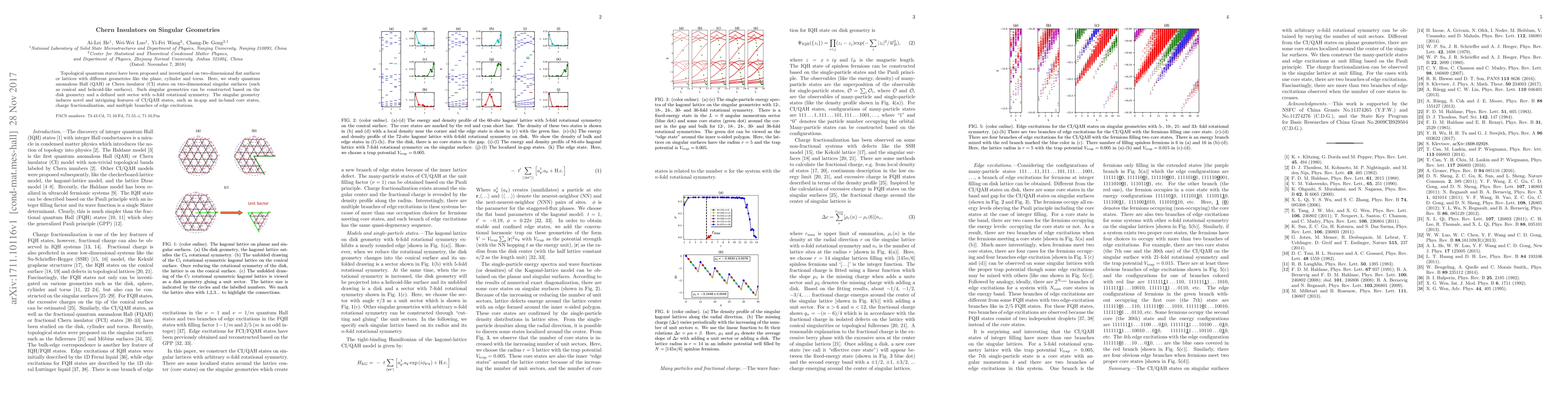 This research explores Chern insulator states on unique two-dimensional singular surfaces, like conical and helicoid-like shapes. These geometries, derived from disk and sector configurations, lead to distinctive features including core states, charge fractionalization, and multiple edge excitation branches in QAH/CI states.