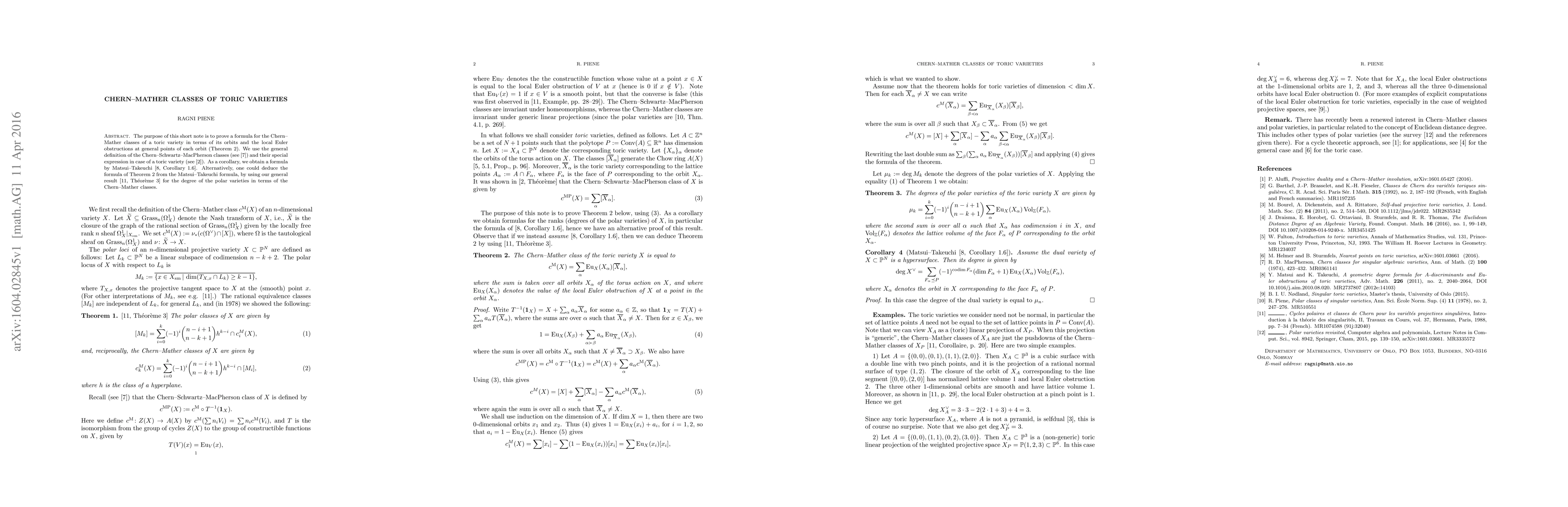 This paper presents a formula for the Chern-Mather classes of toric varieties, expressed in terms of the variety's orbits and local Euler obstructions (Theorem 2). It leverages Chern-Schwartz-MacPherson classes and yields a result that parallels a Matsui-Takeuchi corollary.