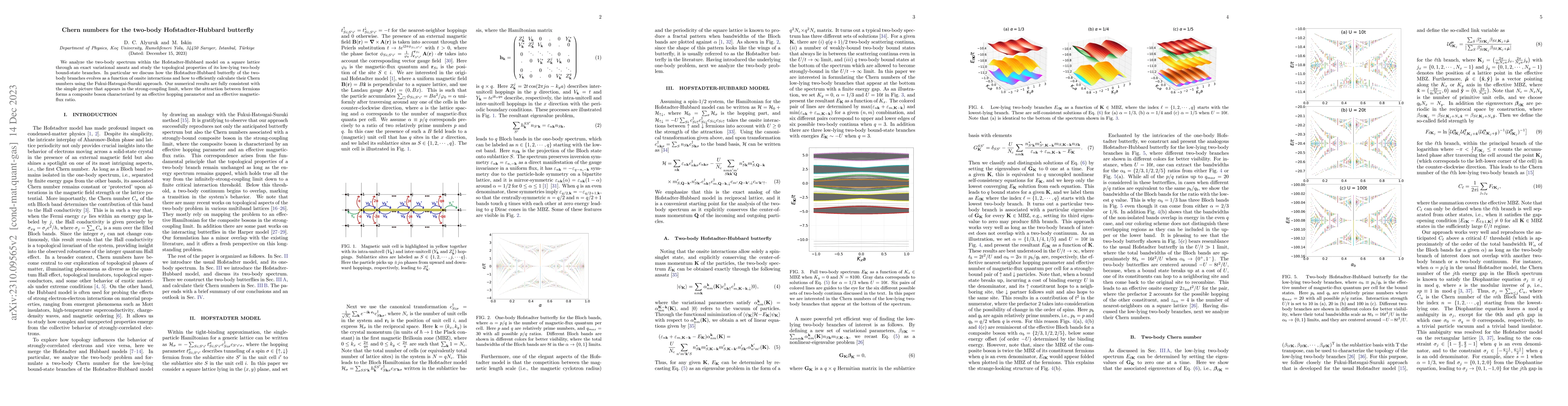 This paper investigates the two-body spectrum in the Hofstadter-Hubbard model on a square lattice, focusing on the topological properties of its low-lying bound states. It employs an exact variational ansatz and calculates Chern numbers using the Fukui-Hatsugai-Suzuki approach, revealing consistent results with the strong-coupling limit where fermions form composite bosons.