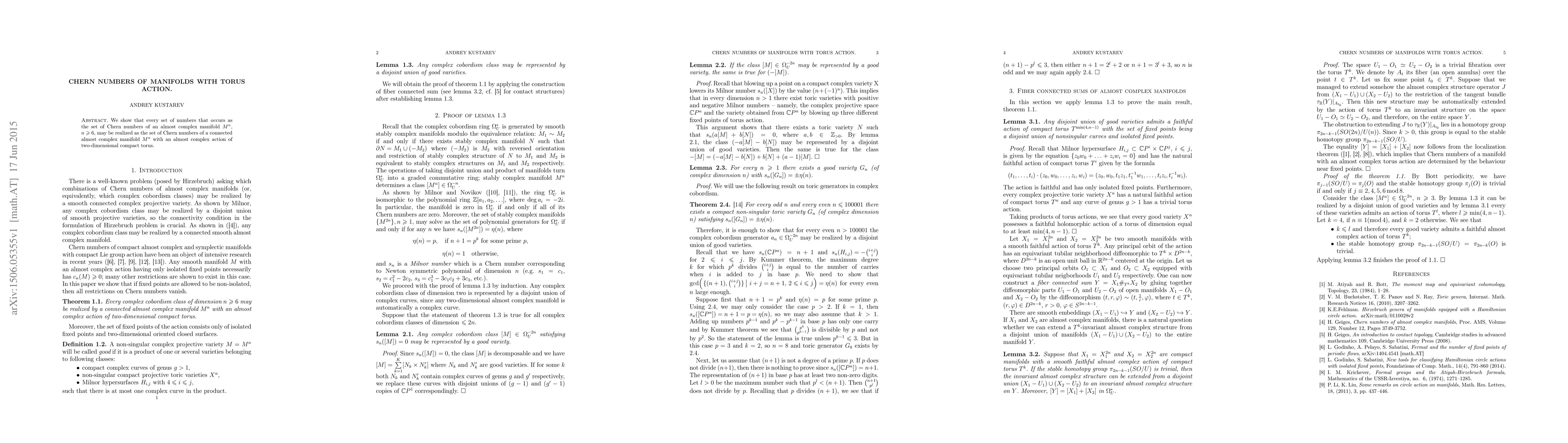 We show that every set of numbers that occurs as the set of Chern numbers of an almost complex manifold $M^{2n}$, $n\geqslant 3$, may be realized as the set of Chern numbers of a connected almost complex manifold with an almost complex action of two-dimensional compact torus.
