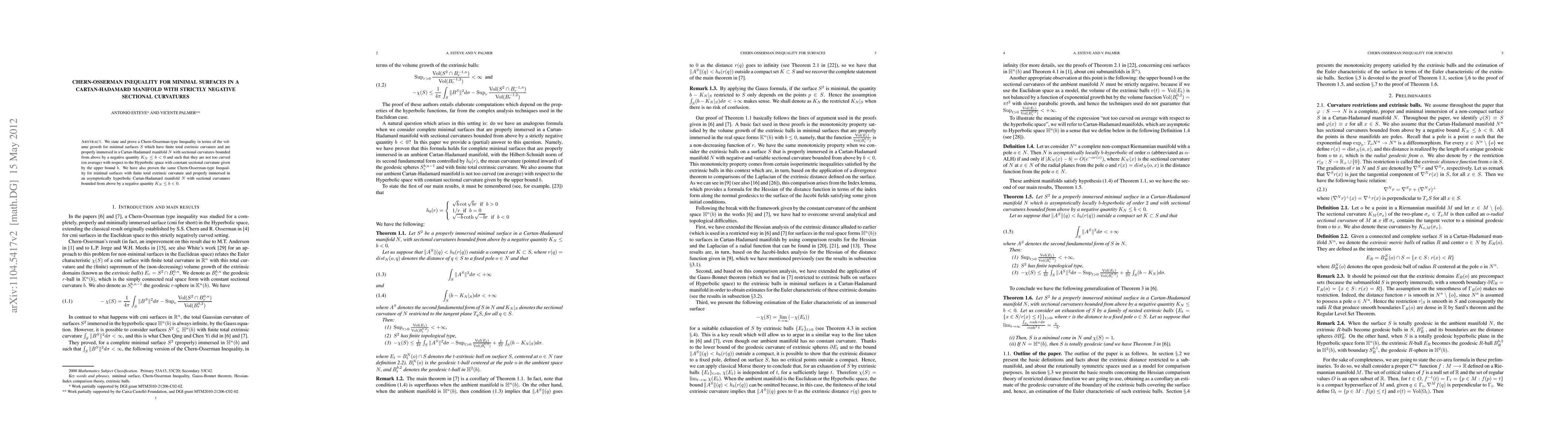 Summary: This paper establishes and proves a Chern-Osserman Inequality concerning the volume growth of minimal surfaces in a Cartan-Hadamard manifold with strictly negative sectional curvatures. The result provides insights into the geometric properties of these minimal surfaces.