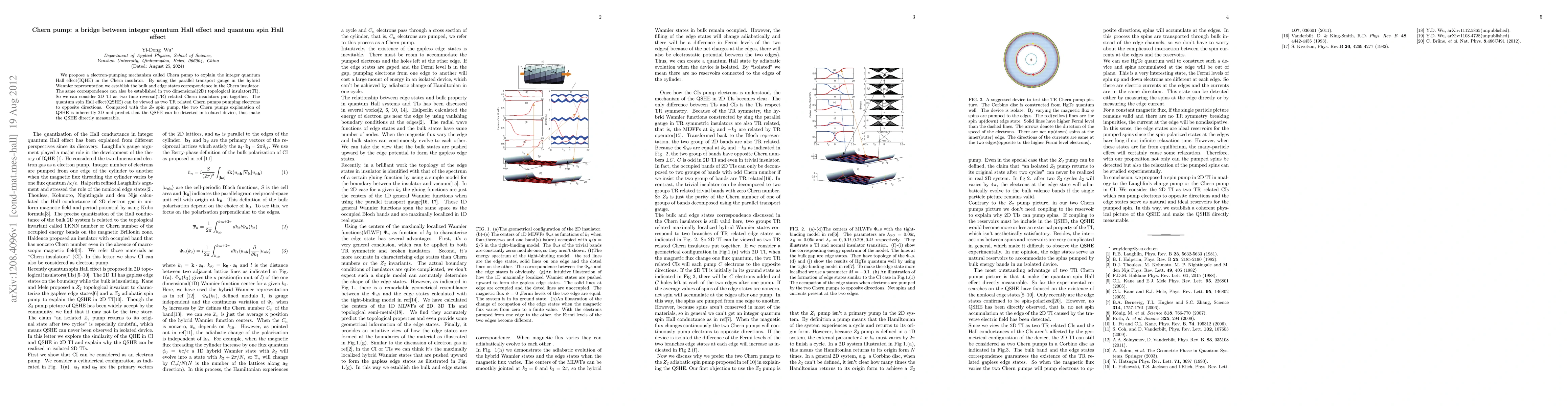 Summary: The paper introduces the Chern pump mechanism to explain the integer quantum Hall effect in Chern insulators, linking it to the quantum spin Hall effect. It proposes that the quantum spin Hall effect can be seen as two Chern pumps in a two-dimensional topological insulator, making it inherently detectable in isolated devices.