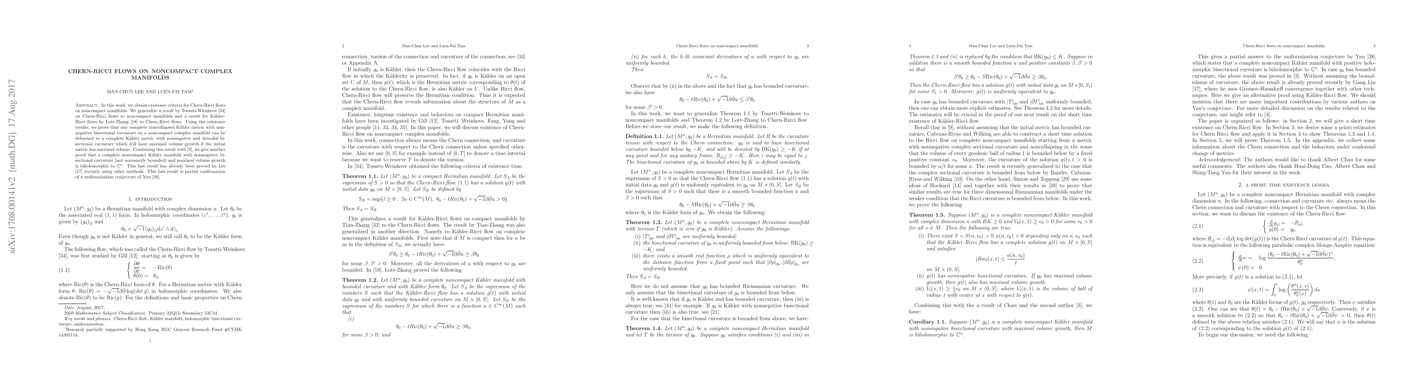In this work, we obtain existence criteria for Chern-Ricci flows on noncompact manifolds. We generalize a result by Tossati-Wienkove on Chern-Ricci flows to noncompact manifolds and at the same time generalize a result for Kahler-Ricci flows by Lott-Zhang to Chern-Ricci flows. Using the existence results, we prove that any complete noncollapsed Kahler metric with nonnegative bisectional curvature on a noncompact complex manifold can be deformed to a complete Kahler metric with nonnegative and bounded bisectional curvature which will have maximal volume growth if the initial metric has maximal volume. Combining this result with the result of Chau-Tam, we give another proof that a complete noncompact Kahler manifold with nonnegative bisectional curvature (not necessarily bounded) and maximal volume growth is biholomorphic to the complex Euclidean space. This last result has already been proved by Gang Liu recently using other methods. This last result is partial confirmation of a uniformization conjecture of Yau.