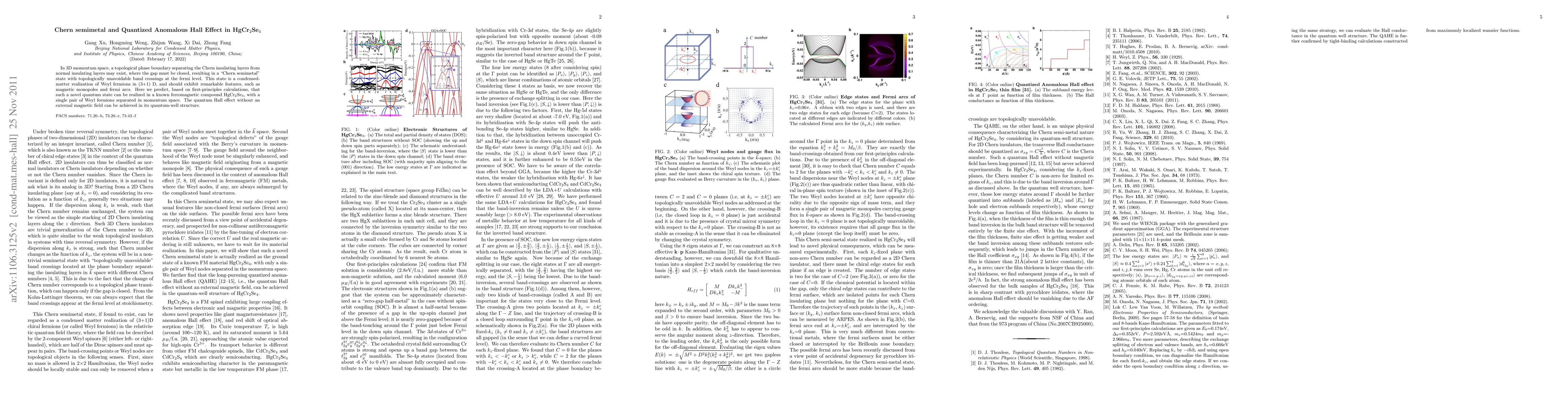 In three dimensional (3D) momentum space of solid crystal, a topological phase boundary separating the Chern insulating layers from normal insulating layers may exist, where the gap must be closed, resulting in a "Chern semi-metal" state with topologically unavoidable band-crossings at fermi level. This state, if found to exist, is a condensed-matter realization of chiral fermions (or called Weyl fermions) in (3+1)D, and should exhibit remarkable features, like magnetic monopoles in the bulk and fermi arcs on the surface. Here we predict, based on first-principles calculations, that such novel quantum state can be realized in a known ferromagnetic compound HgCr2Se4, with a single pair of Weyl fermions separated in momentum space. The characteristic feature of this state in HgCr2Se4 is the presence of quantum Hall effect without external magnetic field in its quantum-well structure.
