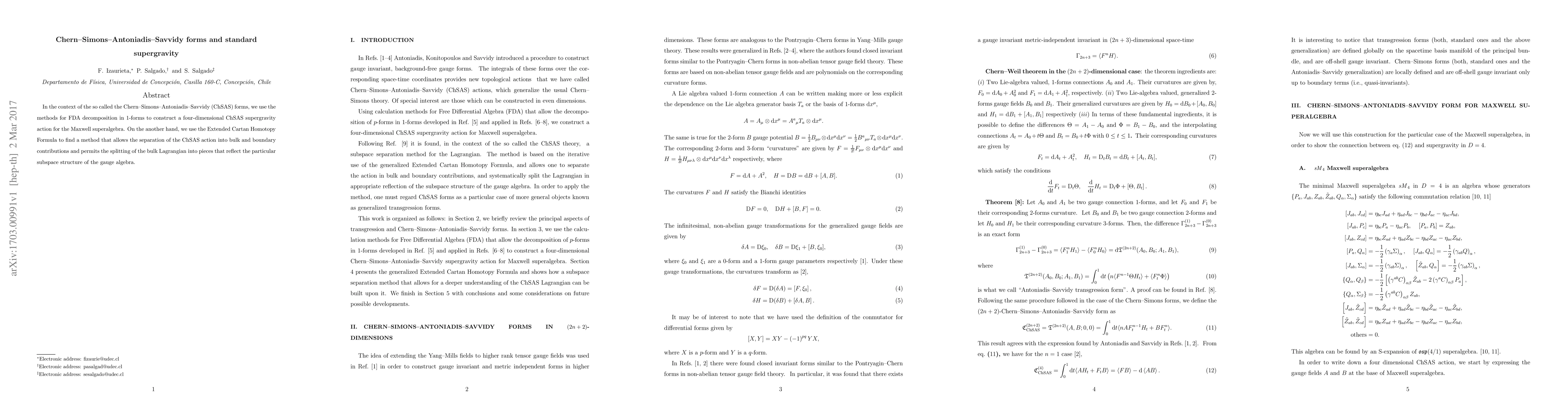 In the context of the so called the Chern--Simons--Antoniadis--Savvidy (ChSAS) forms, we use the methods for FDA decomposition in 1-forms to construct a four-dimensional ChSAS supergravity action for the Maxwell superalgebra. On the another hand, we use the Extended Cartan Homotopy Formula to find a method that allows the separation of the ChSAS action into bulk and boundary contributions and permits the splitting of the bulk Lagrangian into pieces that reflect the particular subspace structure of the gauge algebra.