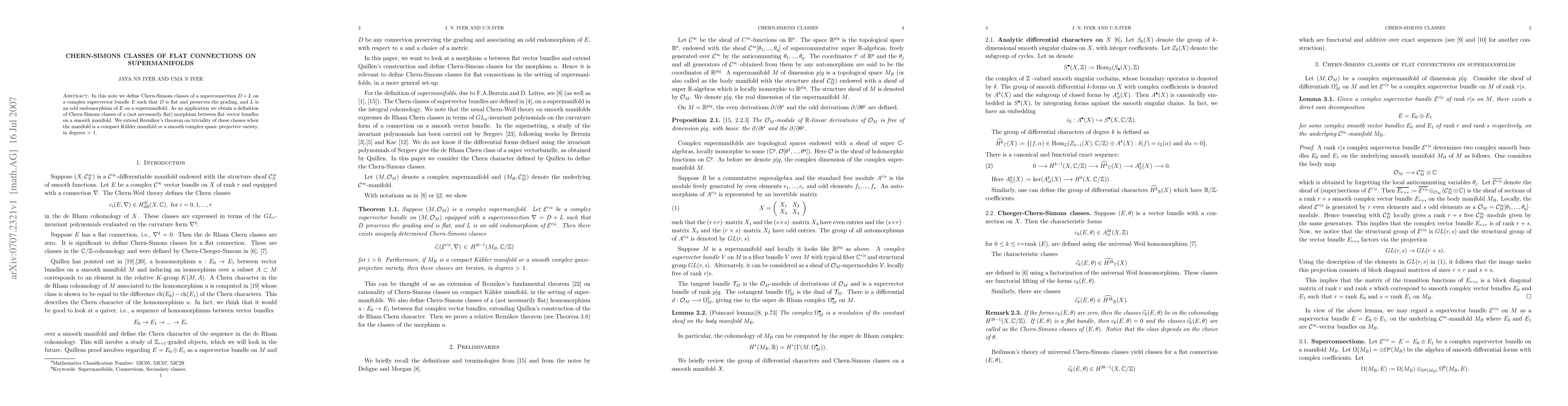 This paper defines Chern-Simons classes for superconnections on complex supervector bundles, focusing on flat connections preserving grading, and extends Reznikov's theorem to higher degrees on specific types of manifolds. The work also applies to morphisms between flat vector bundles on smooth manifolds.