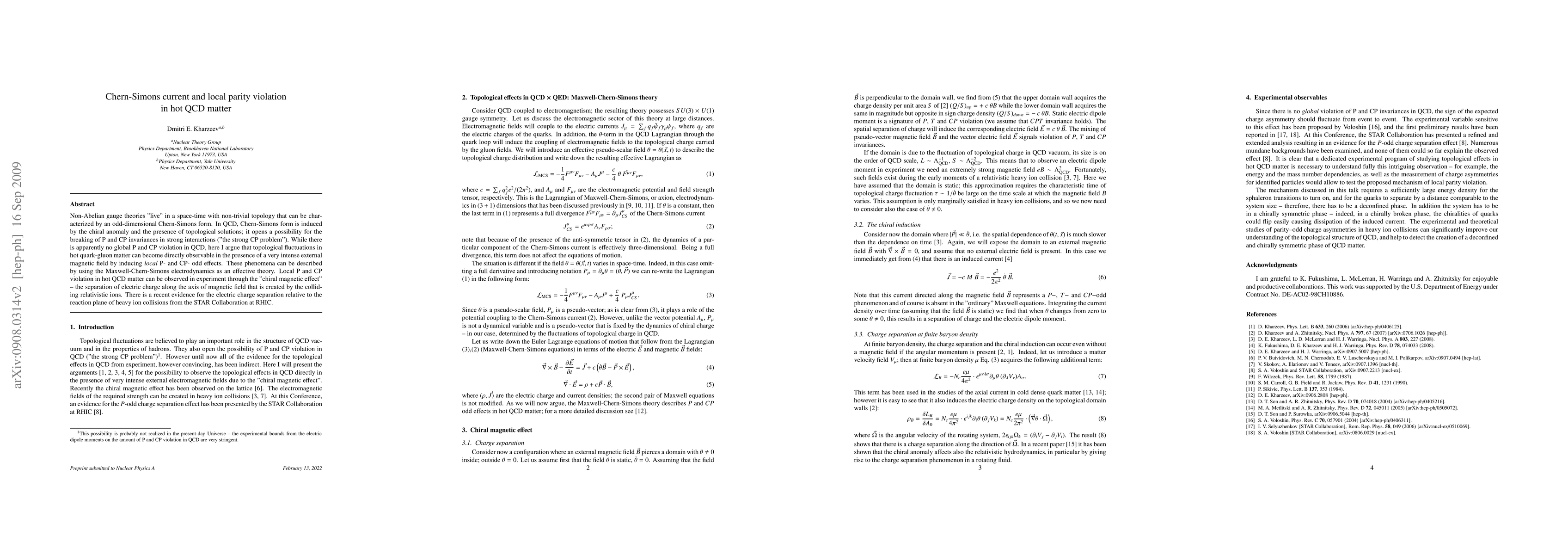 Non-Abelian gauge theories "live" in a space-time with non-trivial topology that can be characterized by an odd-dimensional Chern-Simons form. In QCD, Chern-Simons form is induced by the chiral anomaly and the presence of topological solutions; it opens a possibility for the breaking of P and CP invariances in strong interactions ("the strong CP problem"). While there is apparently no global P and CP violation in QCD, here I argue that topological fluctuations in hot quark-gluon matter can become directly observable in the presence of a very intense external magnetic field by inducing local P- and CP- odd effects. These phenomena can be described by using the Maxwell-Chern-Simons electrodynamics as an effective theory. Local P and CP violation in hot QCD matter can be observed in experiment through the "chiral magnetic effect" - the separation of electric charge along the axis of magnetic field that is created by the colliding relativistic ions. There is a recent evidence for the electric charge separation relative to the reaction plane of heavy ion collisions from the STAR Collaboration at RHIC.