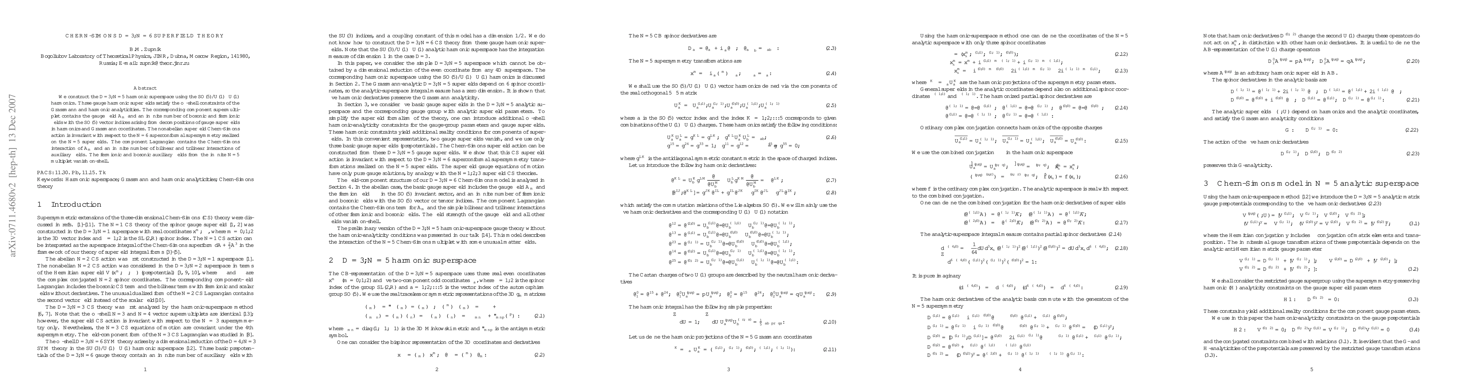 We construct the D=3, N=5 harmonic superspace using the SO(5)/U(1) x U(1) harmonics. Three gauge harmonic superfields satisfy the off-shell constraints of the Grassmann and harmonic analyticities. The corresponding component supermultiplet contains the gauge field A_m and an infinite number of bosonic and fermionic fields with the SO(5) vector indices arising from decompositions of gauge superfields in harmonics and Grassmann coordinates. The nonabelian superfield Chern-Simons action is invariant with respect to the N=6 superconformal supersymmetry realized on the N=5 superfields. The component Lagrangian contains the Chern-Simons interaction of A_m and an infinite number of bilinear and trilinear interactions of auxiliary fields. The fermionic and bosonic auxiliary fields from the infinite N=5 multiplet vanish on-shell.