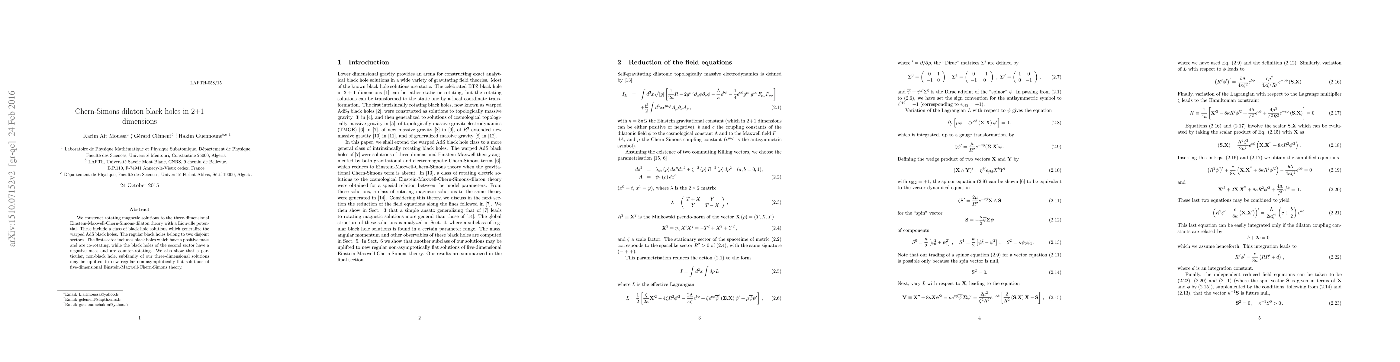 We construct rotating magnetic solutions to the three-dimensional Einstein-Maxwell-Chern-Simons-dilaton theory with a Liouville potential. These include a class of black hole solutions which generalize the warped AdS black holes. The regular black holes belong to two disjoint sectors. The first sector includes black holes which have a positive mass and are co-rotating, while the black holes of the second sector have a negative mass and are counter-rotating. We also show that a particular, non-black hole, subfamily of our three-dimensional solutions may be uplifted to new regular non-asymptotically flat solutions of five-dimensional Einstein-Maxwell-Chern-Simons theory.