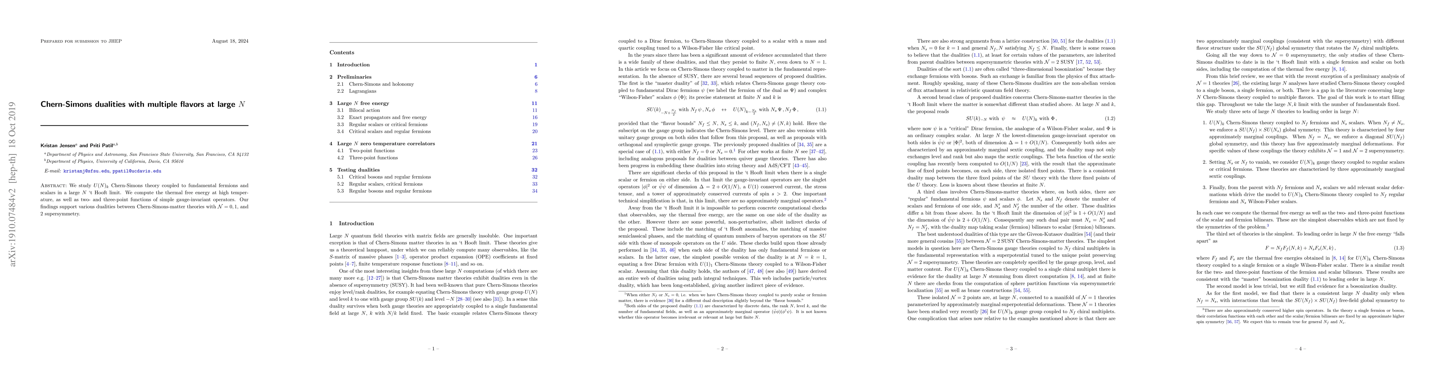 This paper explores $U(N)_k$ Chern-Simons theories with fermions and scalars in the large $N$ limit, finding support for dualities among Chern-Simons-matter theories with different supersymmetry levels by computing thermal free energy and gauge-invariant correlation functions.