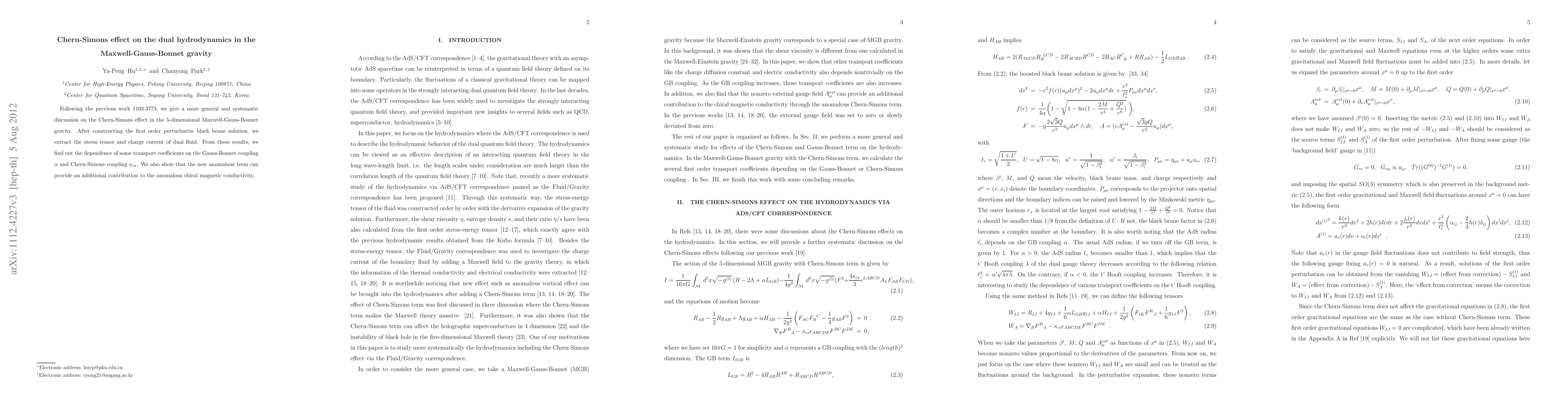 Following the previous work 1103.3773, we give a more general and systematic discussion on the Chern-Simons effect in the 5-dimensional Maxwell-Gauss-Bonnet gravity. After constructing the first order perturbative black brane solution, we extract the stress tensor and charge current of dual fluid. From these results, we find out the dependence of some transport coefficients on the Gauss-Bonnet coupling $\alpha$ and Chern-Simons coupling $\kappa_{cs}$. We also show that the new anomalous term can provide an additional contribution to the anomalous chiral magnetic conductivity.