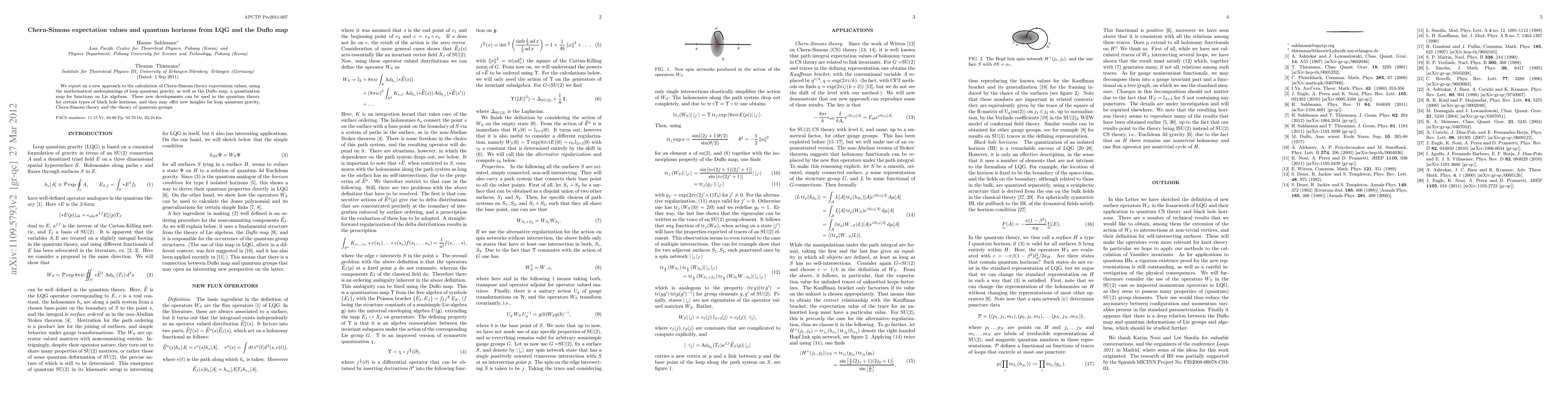 We report on a new approach to the calculation of Chern-Simons theory expectation values, using the mathematical underpinnings of loop quantum gravity, as well as the Duflo map, a quantization map for functions on Lie algebras. These new developments can be used in the quantum theory for certain types of black hole horizons, and they may offer new insights for loop quantum gravity, Chern-Simons theory and the theory of quantum groups.
