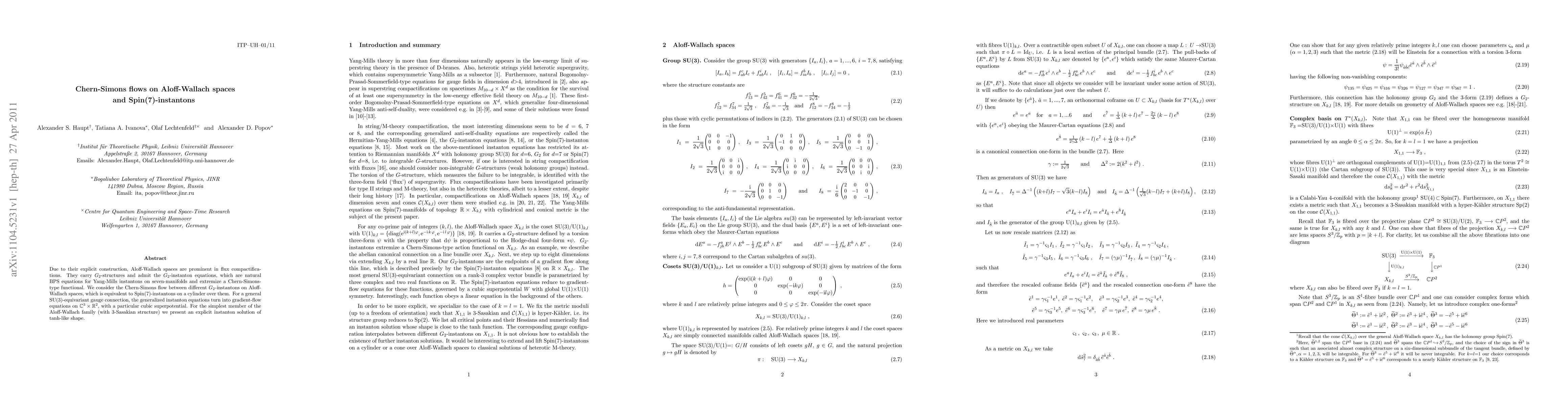 Due to their explicit construction, Aloff-Wallach spaces are prominent in flux compactifications. They carry G_2-structures and admit the G_2-instanton equations, which are natural BPS equations for Yang-Mills instantons on seven-manifolds and extremize a Chern-Simons-type functional. We consider the Chern-Simons flow between different G_2-instantons on Aloff-Wallach spaces, which is equivalent to Spin(7)-instantons on a cylinder over them. For a general SU(3)-equivariant gauge connection, the generalized instanton equations turn into gradient-flow equations on C^3 x R^2, with a particular cubic superpotential. For the simplest member of the Aloff-Wallach family (with 3-Sasakian structure) we present an explicit instanton solution of tanh-like shape.
