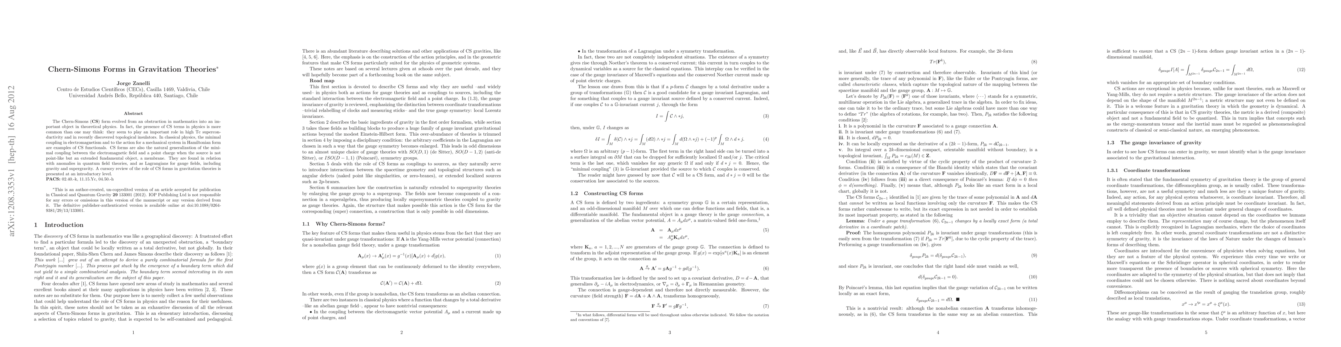 This paper provides an introductory review of Chern-Simons (CS) forms, tracing their evolution from mathematical obstructions to significant objects in theoretical physics, particularly in gravitation theories. It highlights their role in high Tc superconductivity, topological insulators, and as Lagrangians for gauge fields, including gravity and supergravity.