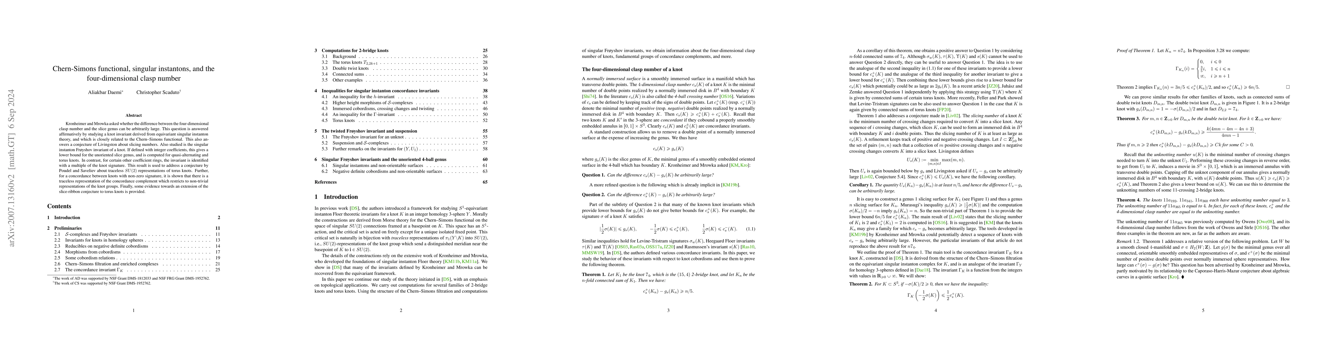 This paper affirms that the difference between the four-dimensional clasp number and the slice genus can be arbitrarily large by utilizing a knot invariant derived from equivariant singular instanton theory linked to the Chern-Simons functional. It also provides a lower bound for the unoriented slice genus for certain knots and addresses conjectures on knot signatures and representations.