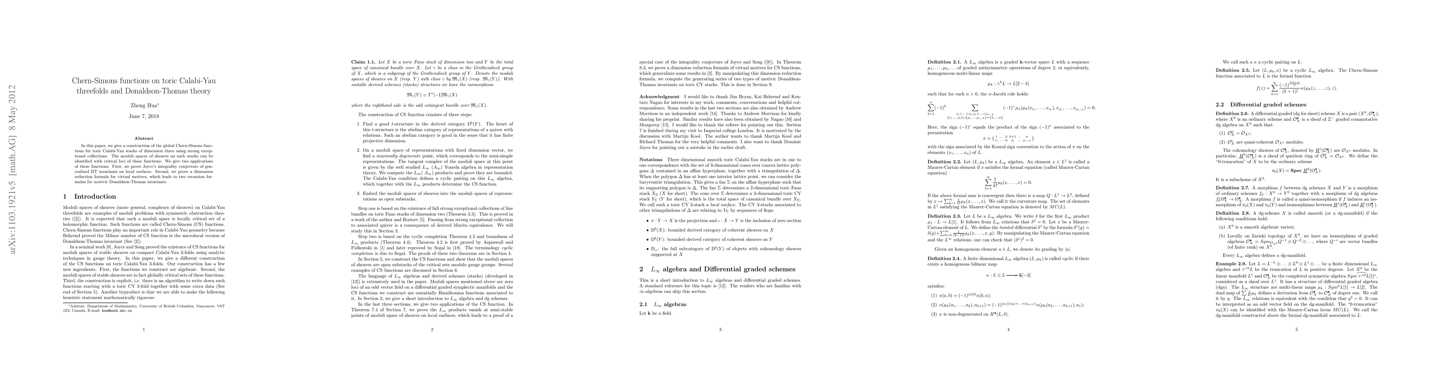 In this paper, we give a construction of the global Chern-Simons functions for toric Calabi-Yau stacks of dimension three using strong exceptional collections. The moduli spaces of sheaves on such stacks can be identified with critical loci of these functions. We give two applications of these functions. First, we prove Joyce's integrality conjecture of generalized DT invariants on local surfaces. Second, we prove a dimension reduction formula for virtual motives, which leads to two recursion formulas for motivic Donaldson-Thomas invariants.