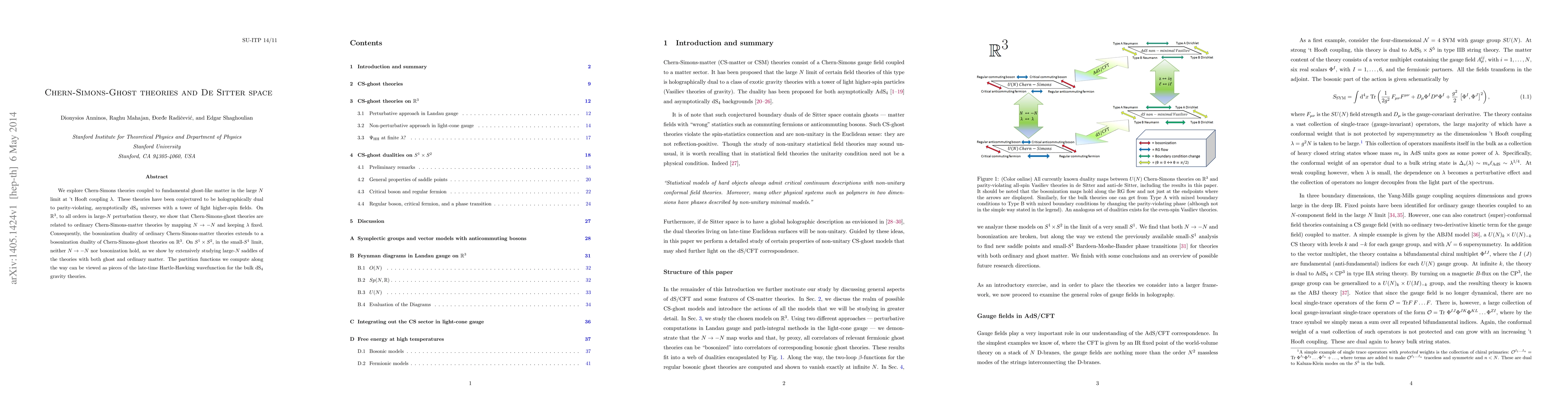 We explore Chern-Simons theories coupled to fundamental ghost-like matter in the large $N$ limit at 't Hooft coupling $\lambda$. These theories have been conjectured to be holographically dual to parity-violating, asymptotically dS$_4$ universes with a tower of light higher-spin fields. On $\mathbb{R}^3$, to all orders in large-$N$ perturbation theory, we show that Chern-Simons-ghost theories are related to ordinary Chern-Simons-matter theories by mapping $N \rightarrow - N$ and keeping $\lambda$ fixed. Consequently, the bosonization duality of ordinary Chern-Simons-matter theories extends to a bosonization duality of Chern-Simons-ghost theories on $\mathbb R^3$. On $S^1 \times S^2$, in the small-$S^1$ limit, neither $N \rightarrow -N$ nor bosonization hold, as we show by extensively studying large-$N$ saddles of the theories with both ghost and ordinary matter. The partition functions we compute along the way can be viewed as pieces of the late-time Hartle-Hawking wavefunction for the bulk dS$_4$ gravity theories.