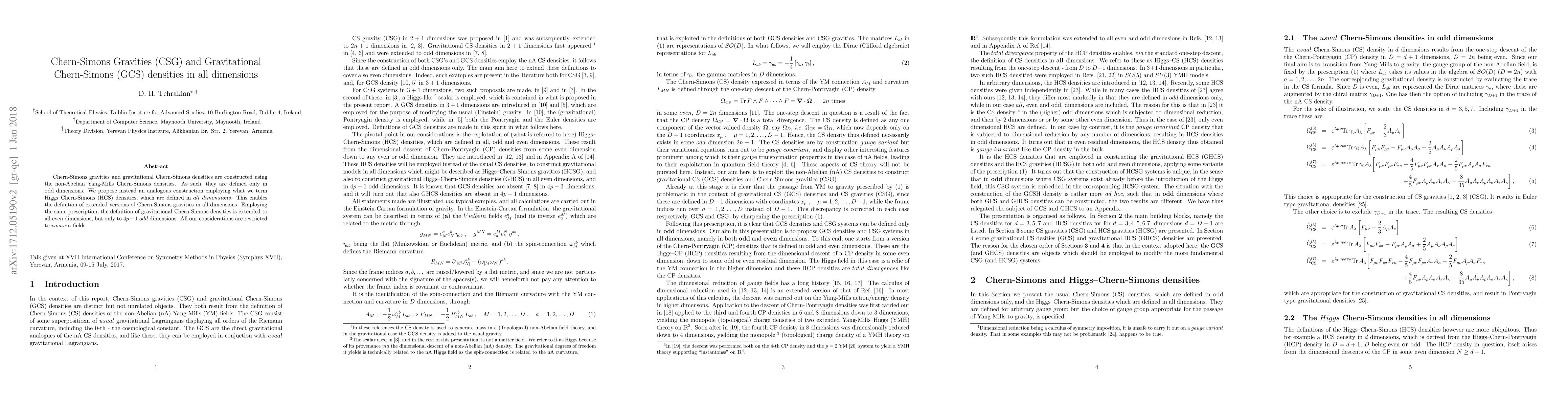 Chern-Simons gravities and gravitational Chern-Simons densities are constructed using the non-Abelian Yang-Mills Chern-Simons densities. As such, they are defined only in odd dimensions. We propose instead an analogous construction employing what we term Higgs--Chern-Simons (HCS) densities, which are defined in $all\ dimensions$. This enables the definition of extended versions of Chern-Simons gravities in all dimensions. Employing the same prescription, the definition of gravitational Chern-Simons densities is extended to all even dimensions, but only to $4p-1$ $odd$ dimensions. All our considerations are restricted to $vacuum$ fields.