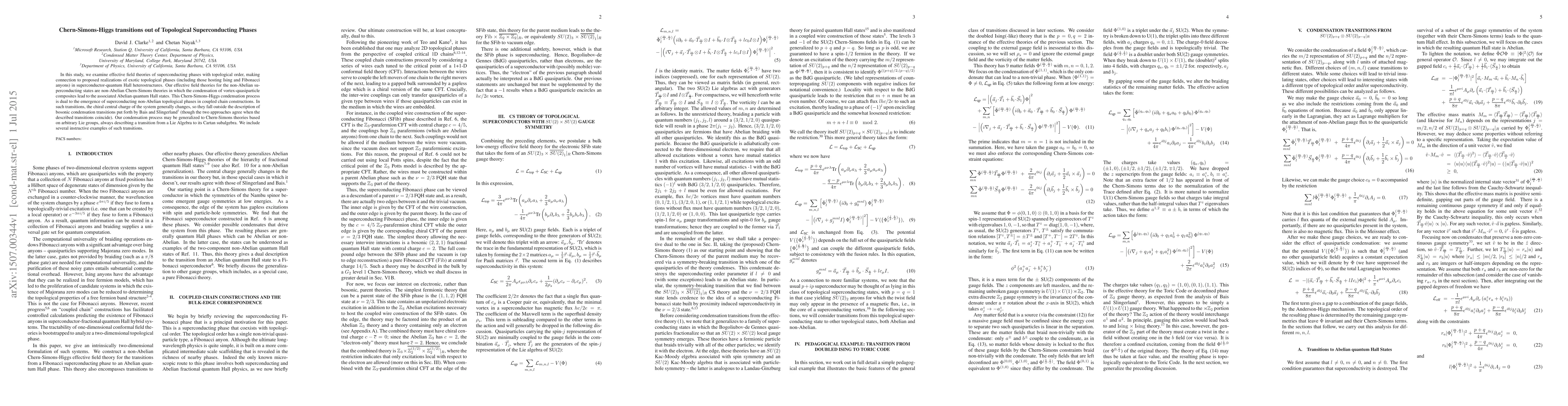 In this study, we examine effective field theories of superconducting phases with topological order, making connection to proposed realizations of exotic topological phases(including those hosting Ising and Fibonacci anyons) in superconductor-quantum Hall heterostructures. Our effective field theories for the non-Abelian superconducting states are non-Abelian Chern-Simons theories in which the condensation of vortex-quasiparticle composites lead to the associated Abelian quantum Hall states. This Chern-Simons-Higgs condensation process is dual to the emergence of superconducting non-Abelian topological phases in coupled chain constructions. In such transitions, the chiral central charge of the system generally changes, so they fall outside the description of bosonic condensation transitions put forth by Bais and Slingerland (though the two approaches agree when the described transitions coincide). Our condensation process may be generalized to Chern-Simons theories based on arbitrary Lie groups, always describing a transition from a Lie Algebra to its Cartan subalgebra. We include several instructive examples of such transitions.