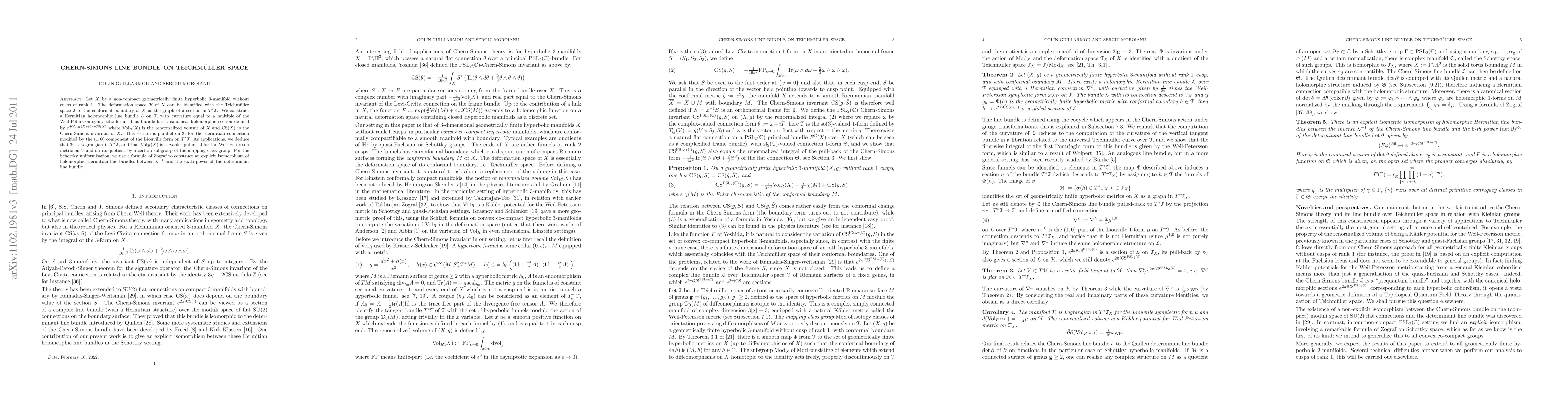 Let $X$ be a non-compact geometrically finite hyperbolic 3-manifold without cusps of rank 1. The deformation space $\mc{H}$ of $X$ can be identified with the Teichm\"uller space $\mc{T}$ of the conformal boundary of $X$ as the graph of a section in $T^*\mc{T}$. We construct a Hermitian holomorphic line bundle $\mc{L}$ on $\mc{T}$, with curvature equal to a multiple of the Weil-Petersson symplectic form. This bundle has a canonical holomorphic section defined by $e^{\frac{1}{\pi}{\rm Vol}_R(X)+2\pi i\CS(X)}$ where ${\rm Vol}_R(X)$ is the renormalized volume of $X$ and $\CS(X)$ is the Chern-Simons invariant of $X$. This section is parallel on $\mc{H}$ for the Hermitian connection modified by the $(1,0)$ component of the Liouville form on $T^*\mc{T}$. As applications, we deduce that $\mc{H}$ is Lagrangian in $T^*\mc{T}$, and that ${\rm Vol}_R(X)$ is a K\"ahler potential for the Weil-Petersson metric on $\mc{T}$ and on its quotient by a certain subgroup of the mapping class group. For the Schottky uniformisation, we use a formula of Zograf to construct an explicit isomorphism of holomorphic Hermitian line bundles between $\mc{L}^{-1}$ and the sixth power of the determinant line bundle.