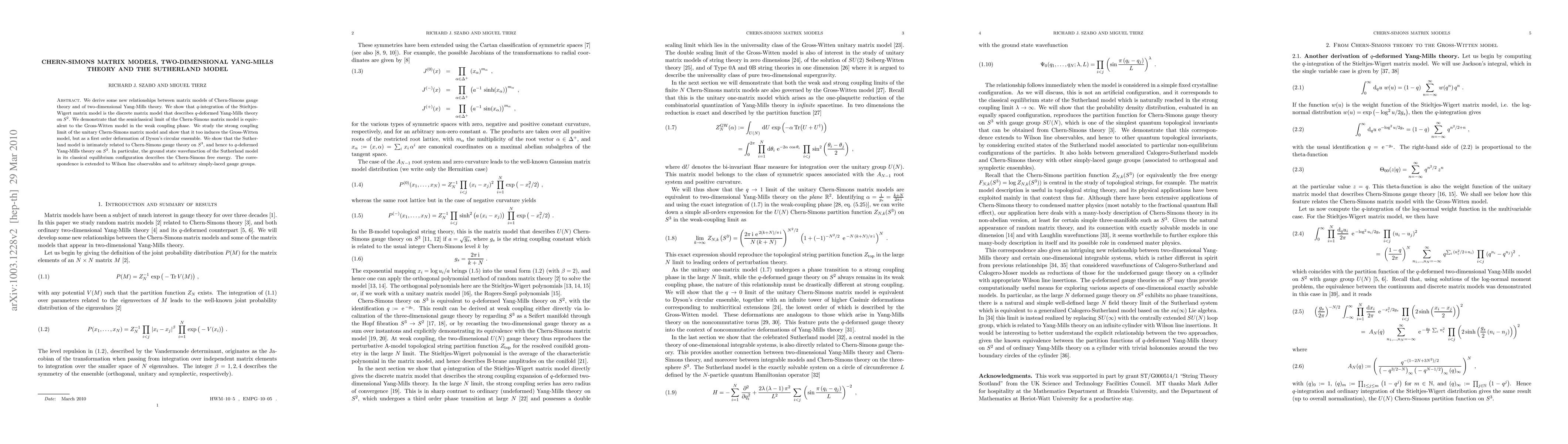This paper establishes new connections between Chern-Simons matrix models and two-dimensional Yang-Mills theory, demonstrating that the q-integration of the Stieltjes-Wigert matrix model corresponds to q-deformed Yang-Mills theory on the 2-sphere. It also shows the equivalence of the semiclassical limit of the Chern-Simons model to the Gross-Witten model in the weak coupling phase and its first-order deformation in the strong coupling limit. The Sutherland model is shown to be related to Chern-Simons gauge theory on the 3-sphere, with its ground state wavefunction describing the Chern-Simons free energy.