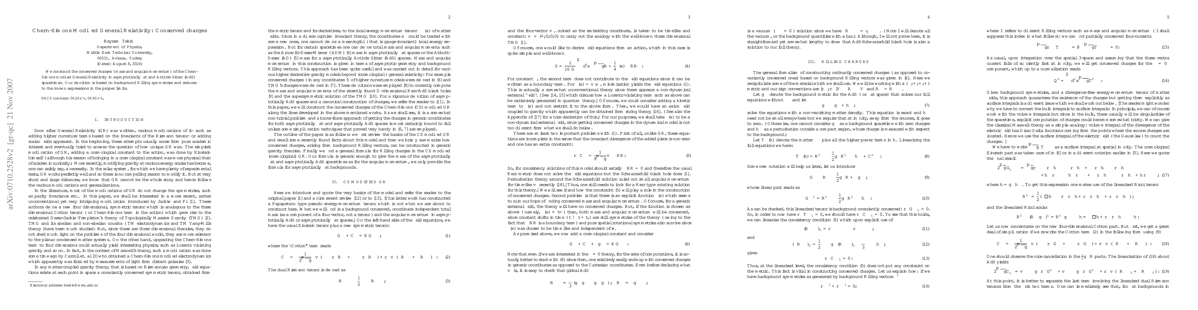The paper constructs conserved charges, including mass and angular momentum, for Chern-Simons modified General Relativity in both asymptotically flat and Anti-de Sitter spacetimes, using background Killing symmetries and aligning with known expressions in relevant limits.