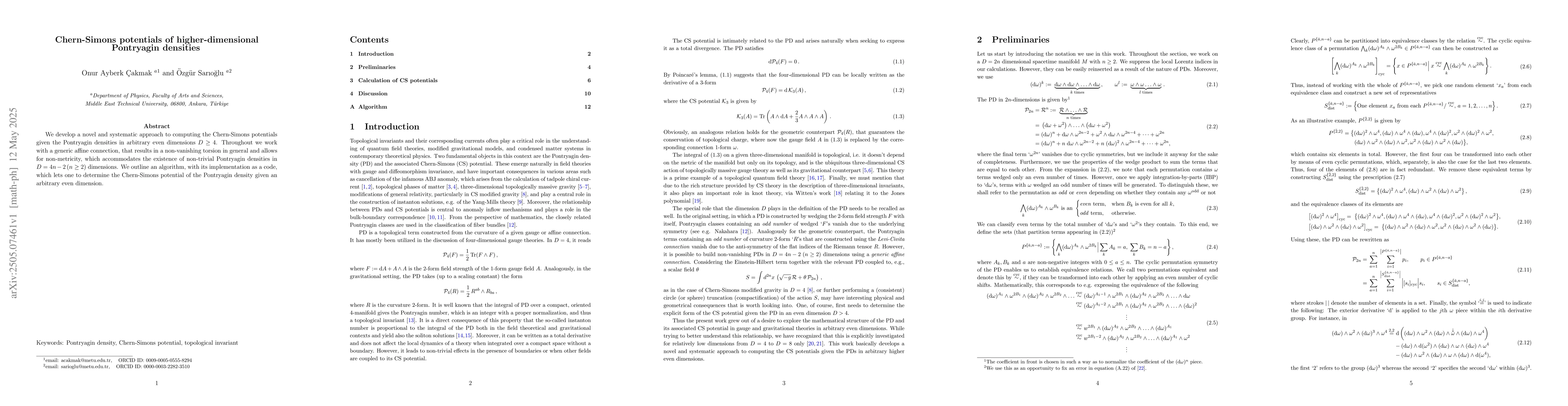 The paper presents an algorithm and its computational implementation to find Chern-Simons potentials from Pontryagin densities in higher dimensions, extending existing methods to higher dimensions and accommodating torsion and non-metricity.