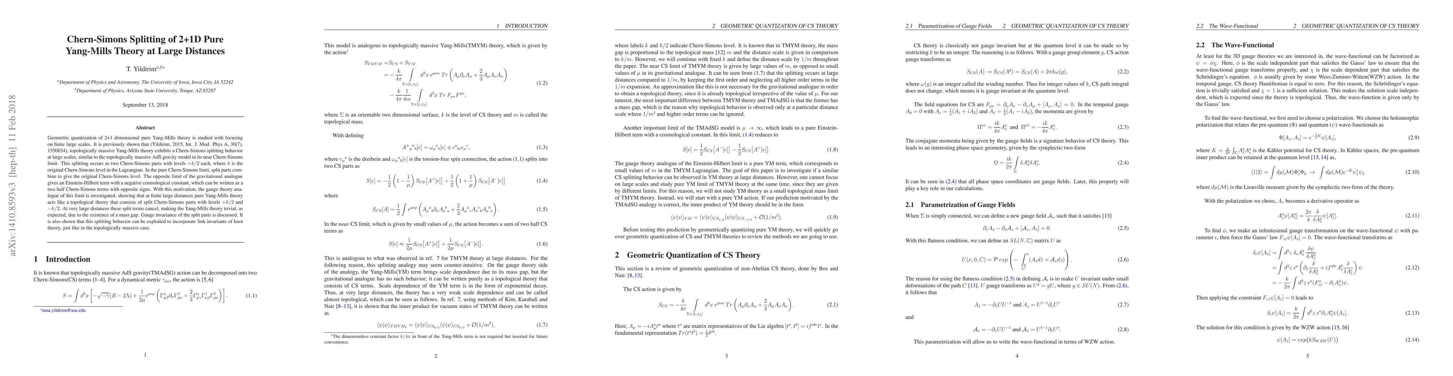 This research investigates the geometric quantization of 2+1D pure Yang-Mills theory at large scales, revealing a Chern-Simons splitting behavior where the theory breaks into two Chern-Simons parts with levels $+k/2$ and $-k/2$. This behavior mirrors the topologically massive AdS gravity model and suggests a gauge-invariant framework incorporating knot theory link invariants.