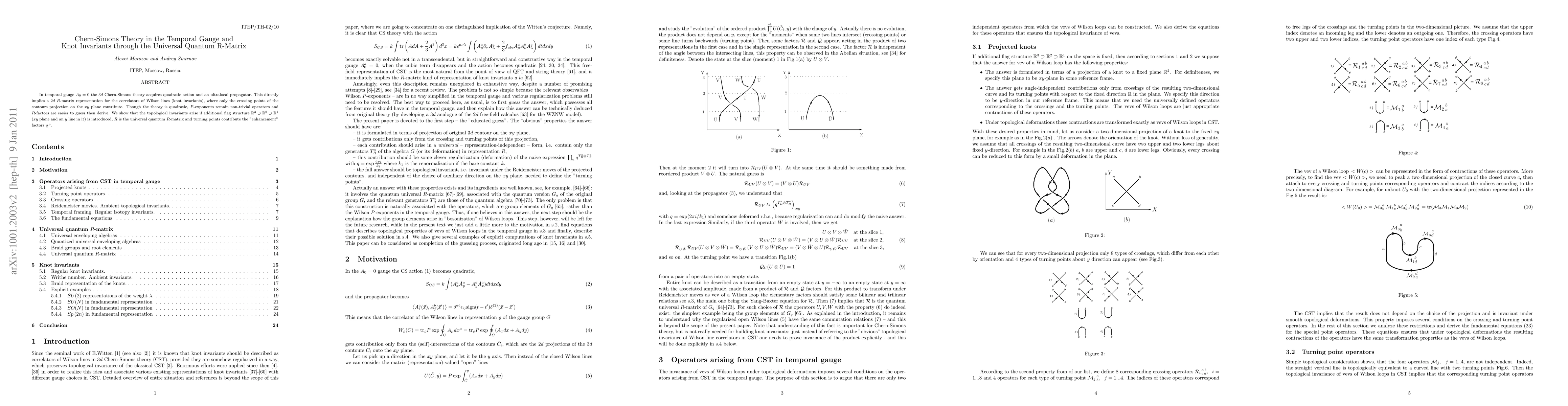 This research paper demonstrates that in temporal gauge of 3D Chern-Simons theory, Wilson line correlators (knot invariants) can be represented via a 2D R-matrix, with crossing points of contours on the xy-plane being crucial. Despite the theory's quadratic nature, non-trivial P-exponents and R-factors are identified. The topological invariants are shown to emerge with an introduced flag structure and the universal quantum R-matrix, where turning points contribute 'enhancement' factors.