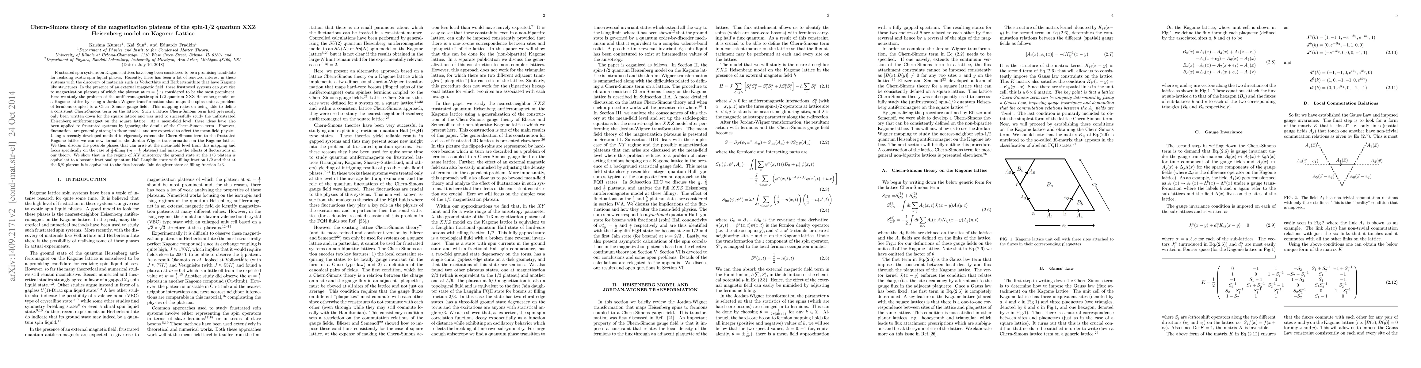 Frustrated spin systems on Kagome lattices have long been considered to be a promising candidate for realizing exotic spin liquid phases. Recently, there has been a lot of renewed interest in these systems with the discovery of materials such as Volborthite and Herbertsmithite that have Kagome like structures. In the presence of an external magnetic field, these frustrated systems can give rise to magnetization plateaus of which the plateau at $m=\frac{1}{3}$ is considered to be the most prominent. Here we study the problem of the antiferromagnetic spin-1/2 quantum XXZ Heisenberg model on a Kagome lattice by using a Jordan-Wigner transformation that maps the spins onto a problem of fermions coupled to a Chern-Simons gauge field. This mapping relies on being able to define a consistent Chern-Simons term on the lattice. Using a recently developed method to rigorously extend the Chern-Simons term to the frustrated Kagome lattice we can now formalize the Jordan-Wigner transformation on the Kagome lattice. We then discuss the possible phases that can arise at the mean-field level from this mapping and focus specifically on the case of $\frac{1}{3}$-filling ($m=\frac{1}{3}$ plateau) and analyze the effects of fluctuations in our theory. We show that in the regime of $XY$ anisotropy the ground state at the $1/3$ plateau is equivalent to a bosonic fractional quantum Hall Laughlin state with filling fraction $1/2$ and that at the $5/9$ plateau it is equivalent to the first bosonic Jain daughter state at filling fraction $2/3$.