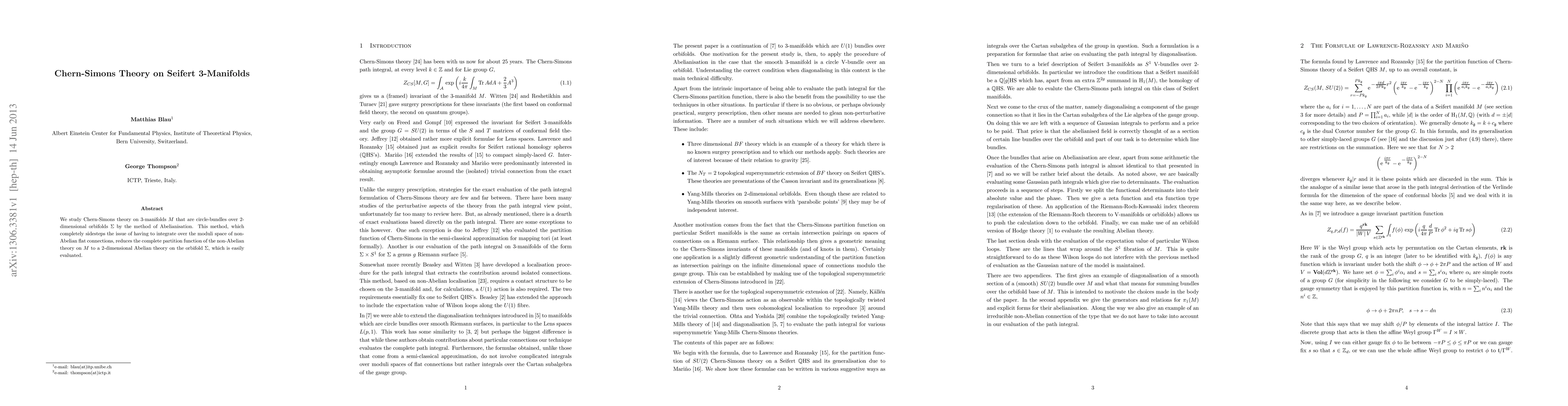 The paper investigates Chern-Simons theory on 3-manifolds M constructed as circle-bundles over 2-dimensional orbifolds S, employing an Abelianisation method that simplifies the partition function evaluation by reducing it to an easily computable Abelian theory on S.