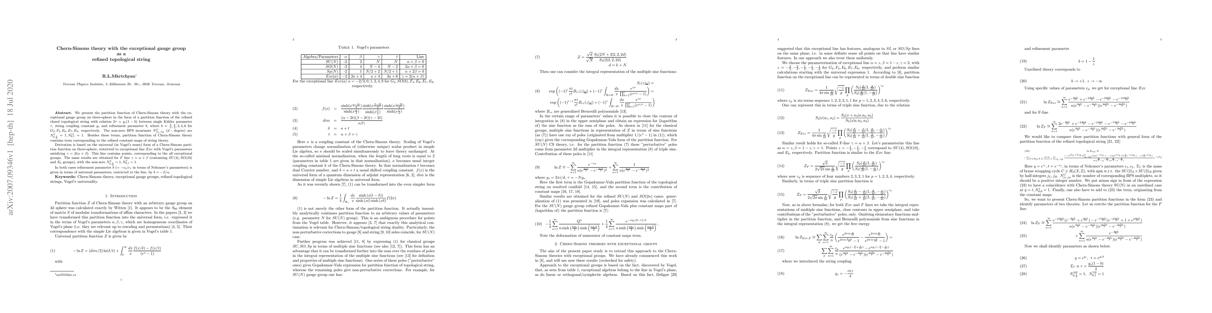 This research derives the partition function of Chern-Simons theory with exceptional gauge groups on a three-sphere, revealing it as a refined closed topological string. It identifies specific non-zero BPS invariants and establishes a relationship between the single Kähler parameter, string coupling constant, and refinement parameter.