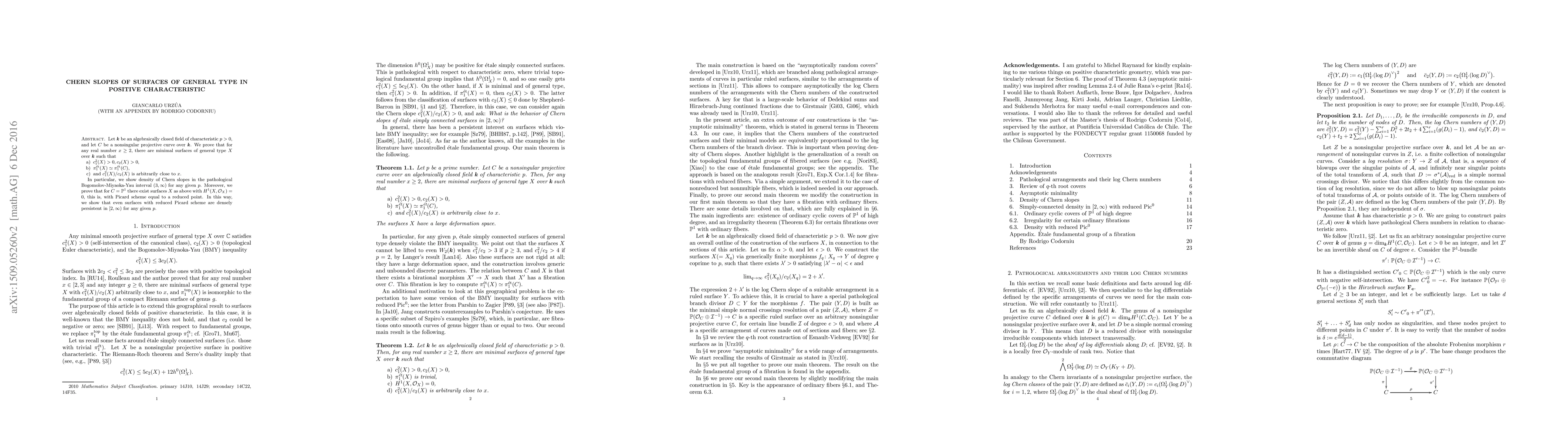 Let $\mathbb{K}$ be an algebraically closed field of characteristic $p>0$, and let $C$ be a nonsingular projective curve over $\mathbb{K}$. We prove that for any real number $x \geq 2$, there are minimal surfaces of general type $X$ over $\mathbb{K}$ such that a) $c_1^2(X)>0, c_2(X)>0$, b) $\pi_1^{\text{\'et}}(X) \simeq \pi_1^{\text{\'et}}(C)$, c) and $c_1^2(X)/c_2(X)$ is arbitrarily close to $x$. In particular, we show density of Chern slopes in the pathological Bogomolov-Miyaoka-Yau interval $]3,\infty[$ for any given $p$. Moreover, we prove that for $C=\mathbb{P}^1$ there exist surfaces $X$ as above with $H^1(X,\mathcal{O}_X)=0$, this is, with Picard scheme equal to a reduced point. In this way, we show that even surfaces with reduced Picard scheme are densely persistent in $[2,\infty[$ for any given $p$.