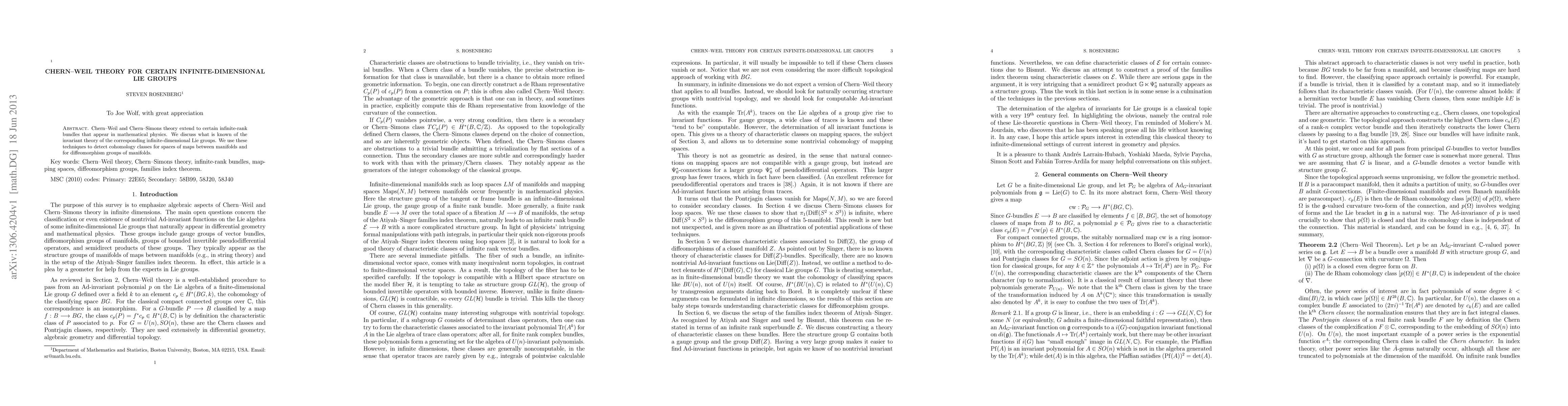 Summary: This paper explores the application of Chern-Weil theory to infinite-dimensional Lie groups, extending it to infinite-rank bundles relevant in mathematical physics, and uses these techniques to analyze cohomology classes in spaces of maps and diffeomorphism groups of manifolds.