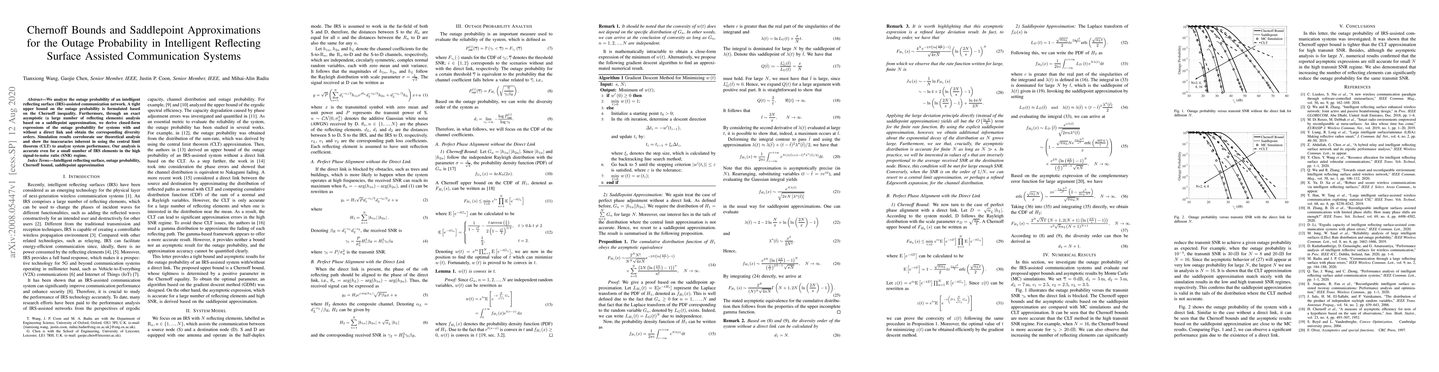 This paper analyzes the outage probability in IRS-assisted communication networks, deriving a tight upper bound using Chernoff bounds and a saddlepoint approximation for exact asymptotic analysis. It provides closed-form expressions for outage probability and diversity orders, demonstrating the method's accuracy even for small IRS element counts in high SNR conditions.