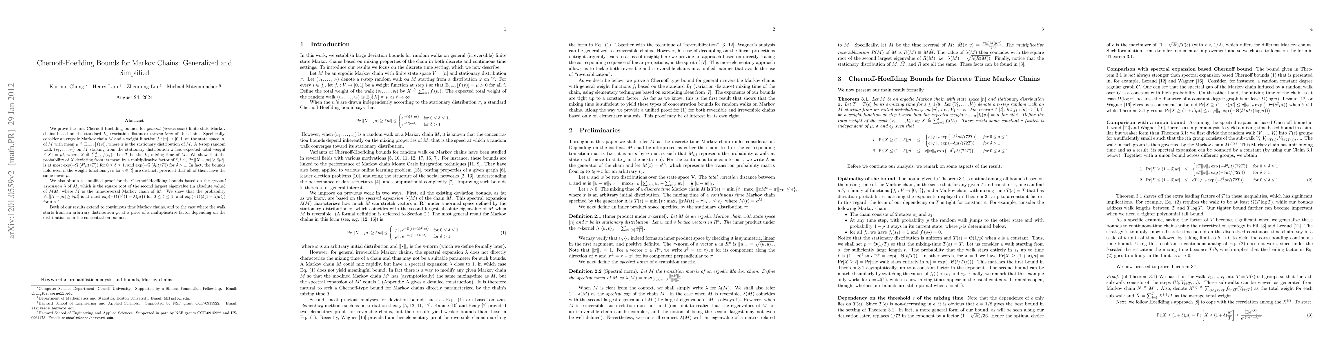 This paper establishes Chernoff-Hoeffding bounds for general nonreversible finite-state Markov chains, showing that the probability of the total weight deviating from its mean is exponentially small. The bounds are derived based on the L_1 mixing-time and simplified using the spectral expansion of the time-reversal Markov chain.