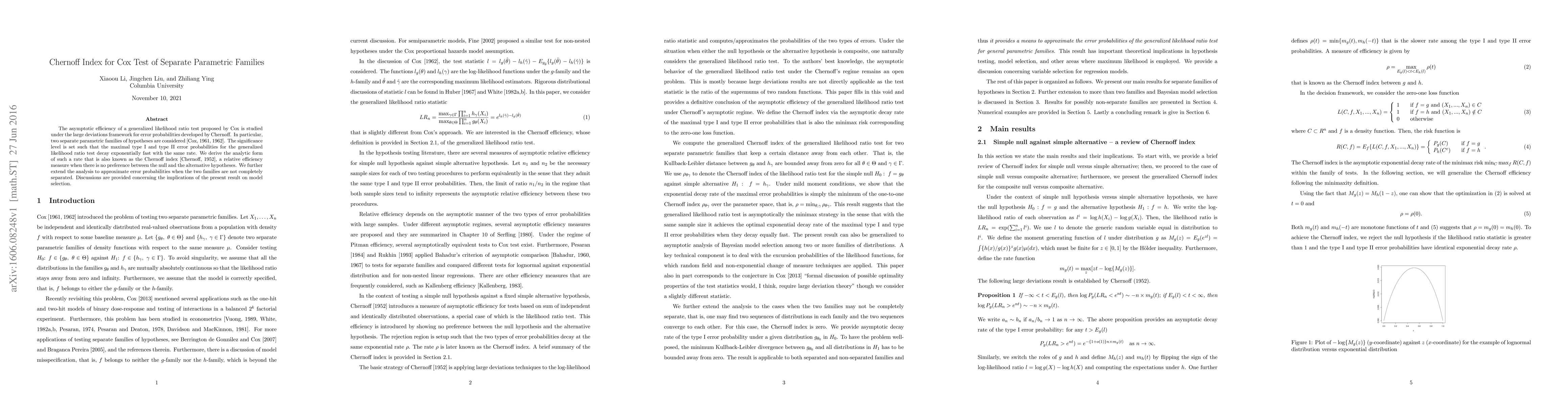This paper studies the asymptotic efficiency of Cox's generalized likelihood ratio test under the Chernoff large deviations framework, deriving the Chernoff index for two separate parametric families. It also extends the analysis to approximate error probabilities when the families are not completely separated, with implications for model selection.