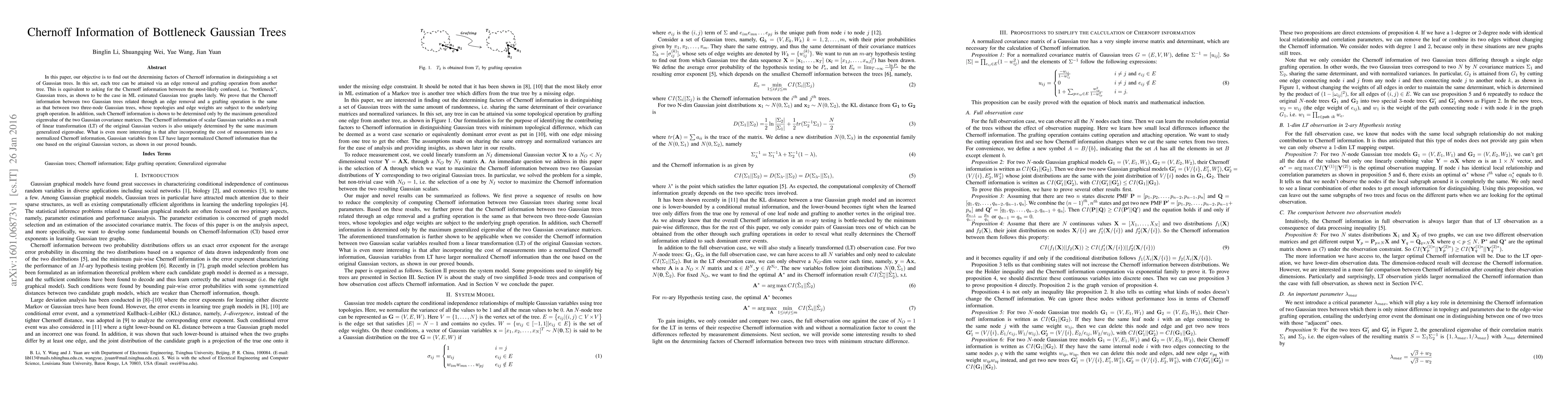 In this paper, our objective is to find out the determining factors of Chernoff information in distinguishing a set of Gaussian trees. In this set, each tree can be attained via an edge removal and grafting operation from another tree. This is equivalent to asking for the Chernoff information between the most-likely confused, i.e. "bottleneck", Gaussian trees, as shown to be the case in ML estimated Gaussian tree graphs lately. We prove that the Chernoff information between two Gaussian trees related through an edge removal and a grafting operation is the same as that between two three-node Gaussian trees, whose topologies and edge weights are subject to the underlying graph operation. In addition, such Chernoff information is shown to be determined only by the maximum generalized eigenvalue of the two Gaussian covariance matrices. The Chernoff information of scalar Gaussian variables as a result of linear transformation (LT) of the original Gaussian vectors is also uniquely determined by the same maximum generalized eigenvalue. What is even more interesting is that after incorporating the cost of measurements into a normalized Chernoff information, Gaussian variables from LT have larger normalized Chernoff information than the one based on the original Gaussian vectors, as shown in our proved bounds