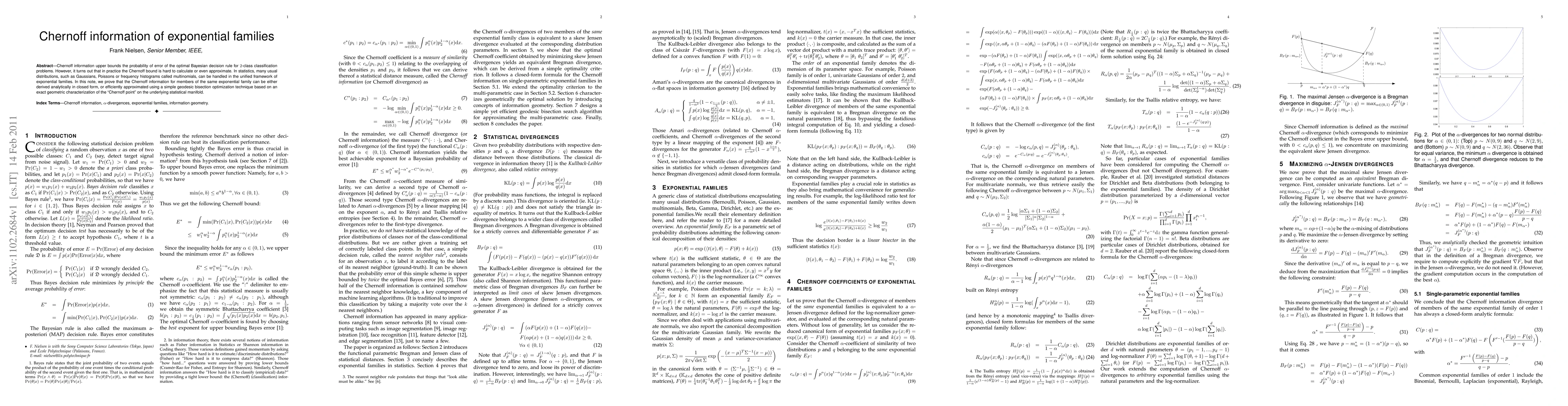 Chernoff information upper bounds the probability of error of the optimal Bayesian decision rule for $2$-class classification problems. However, it turns out that in practice the Chernoff bound is hard to calculate or even approximate. In statistics, many usual distributions, such as Gaussians, Poissons or frequency histograms called multinomials, can be handled in the unified framework of exponential families. In this note, we prove that the Chernoff information for members of the same exponential family can be either derived analytically in closed form, or efficiently approximated using a simple geodesic bisection optimization technique based on an exact geometric characterization of the "Chernoff point" on the underlying statistical manifold.