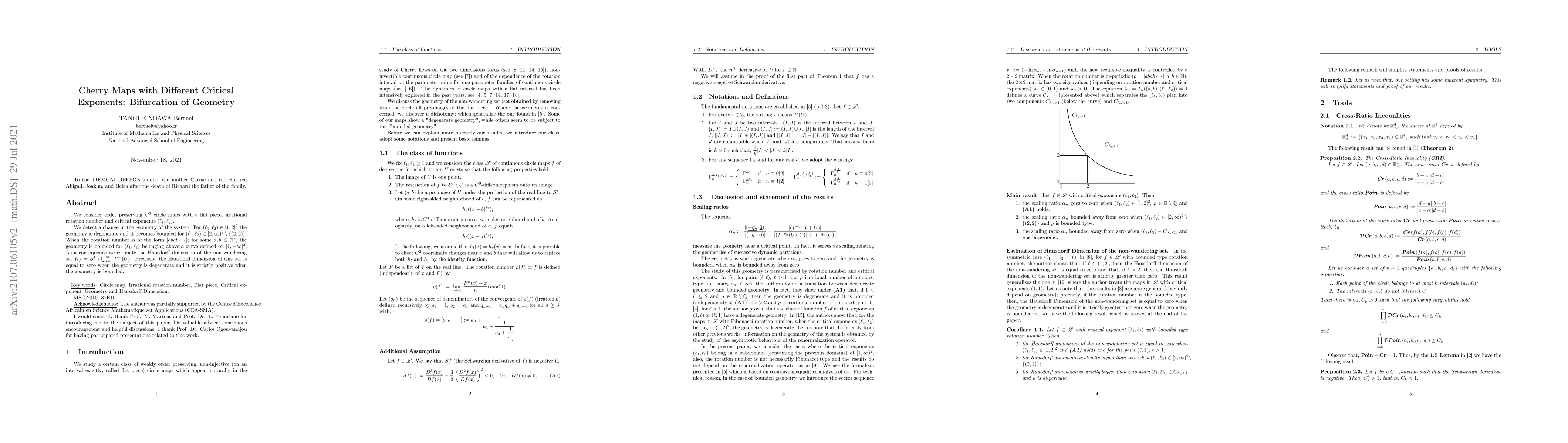 This paper investigates $C^3$ circle maps with a flat piece and irrational rotation numbers, focusing on how different critical exponents $(\ell_1, \ell_2)$ affect the system's geometry. It finds that the geometry transitions from degenerate to bounded based on the values of $(\ell_1, \ell_2)$, and estimates the Hausdorff dimension of the non-wandering set, showing it is zero when the geometry is degenerate and positive when it is bounded.