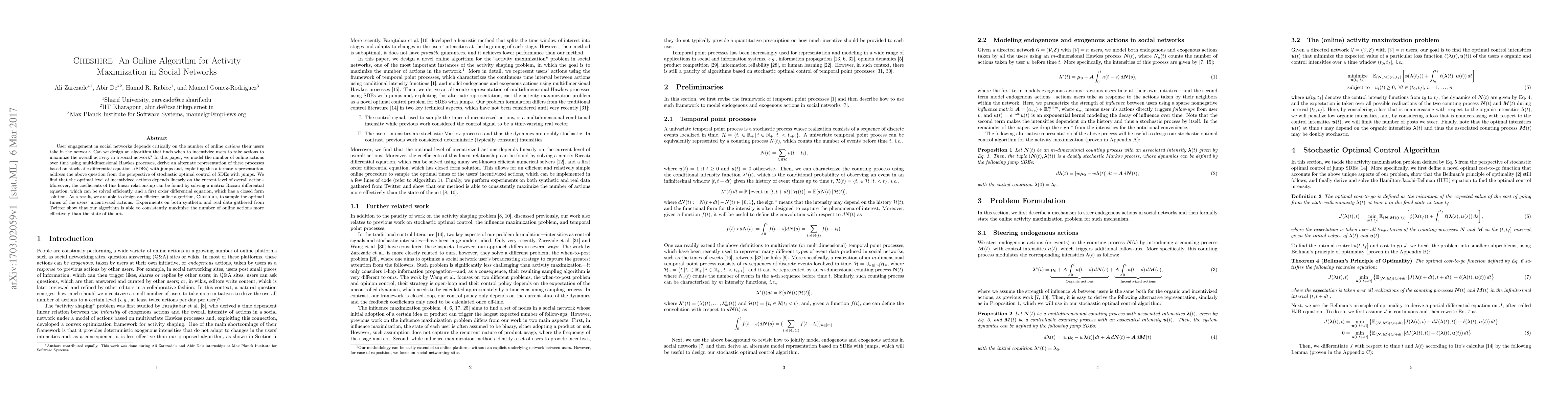 This paper proposes Cheshire, an online algorithm for maximizing user activity in social networks by incentivizing actions. It models user actions using multidimensional Hawkes processes and employs stochastic optimal control to determine optimal incentivized action times, achieving linear relationships between incentivized and overall actions. Cheshire effectively outperforms existing methods in experiments on Twitter data.