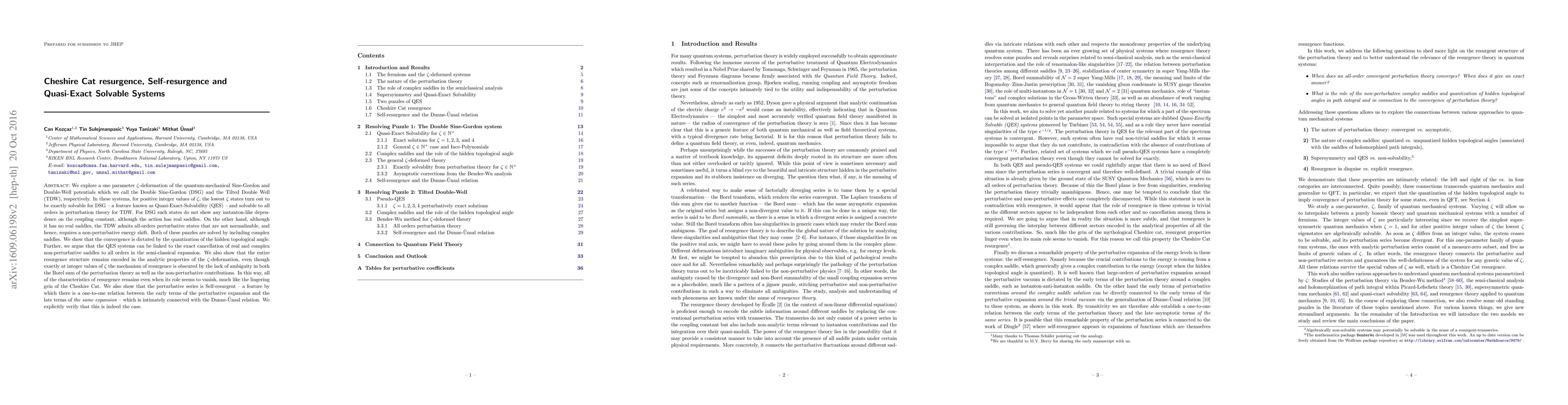 We explore a one parameter $\zeta$-deformation of the quantum-mechanical Sine-Gordon and Double-Well potentials which we call the Double Sine-Gordon (DSG) and the Tilted Double Well (TDW), respectively. In these systems, for positive integer values of $\zeta$, the lowest $\zeta$ states turn out to be exactly solvable for DSG - a feature known as Quasi-Exact-Solvability (QES) - and solvable to all orders in perturbation theory for TDW. For DSG such states do not show any instanton-like dependence on the coupling constant, although the action has real saddles. On the other hand, although it has no real saddles, the TDW admits all-orders perturbative states that are not normalizable, and hence, requires a non-perturbative energy shift. Both of these puzzles are solved by including complex saddles. We show that the convergence is dictated by the quantization of the hidden topological angle. Further, we argue that the QES systems can be linked to the exact cancellation of real and complex non-perturbative saddles to all orders in the semi-classical expansion. We also show that the entire resurgence structure remains encoded in the analytic properties of the $\zeta$-deformation, even though exactly at integer values of $\zeta$ the mechanism of resurgence is obscured by the lack of ambiguity in both the Borel sum of the perturbation theory as well as the non-perturbative contributions. In this way, all of the characteristics of resurgence remains even when its role seems to vanish, much like the lingering grin of the Cheshire Cat. We also show that the perturbative series is Self-resurgent -a feature by which there is a one-to-one relation between the early terms of the perturbative expansion and the late terms of the same expansion -which is intimately connected with the Dunne-\"{U}nsal relation. We explicitly verify that this is indeed the case.