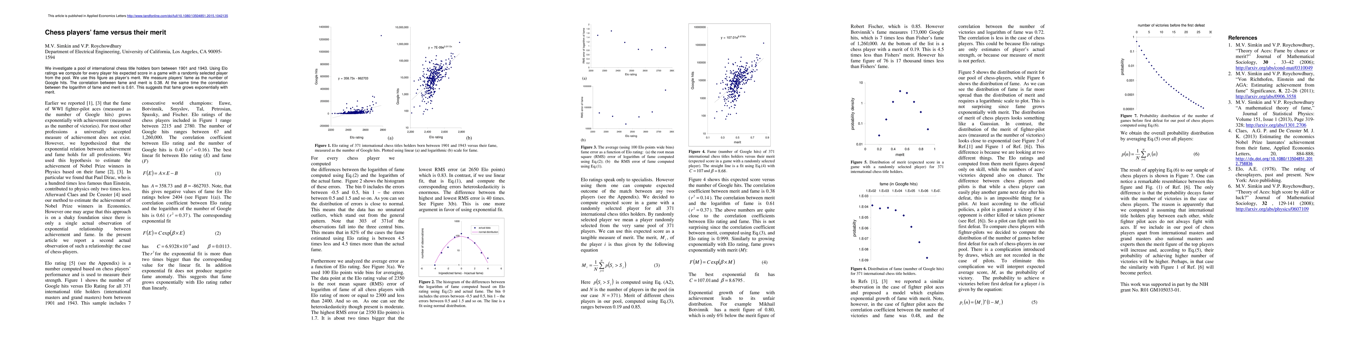 This study examines the correlation between fame and merit among international chess title holders born between 1901 and 1943. It finds a modest linear correlation (0.38) between fame, measured by Google hits, and merit, assessed by Elo ratings, but a stronger exponential correlation (0.61) when fame is logarithmically transformed.