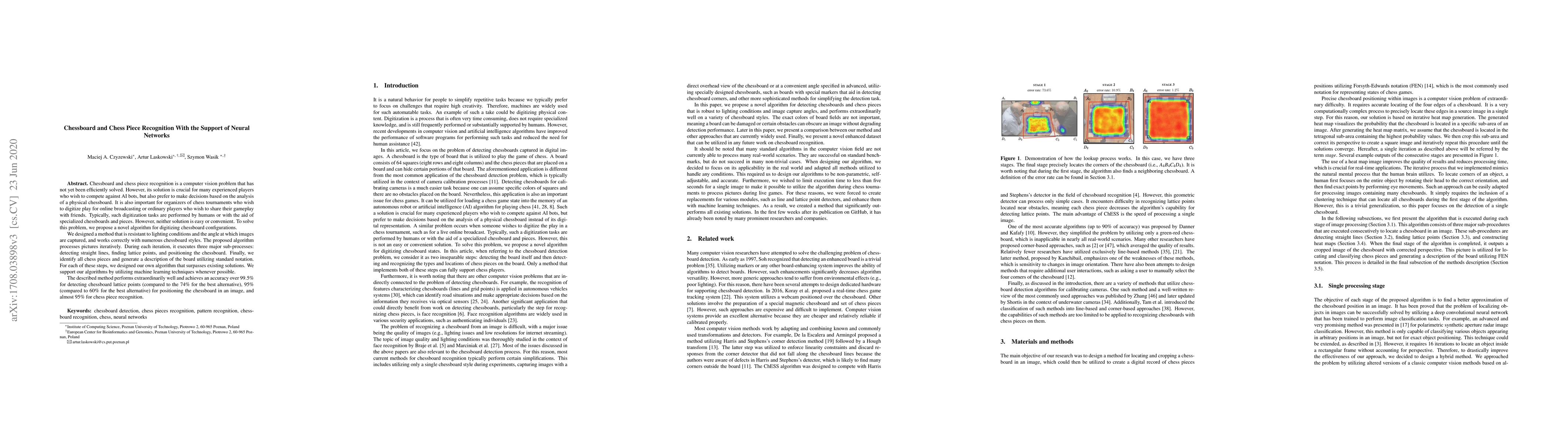 This research proposes a novel neural network-based algorithm for accurately recognizing chessboards and chess pieces in images, achieving over 99.5% accuracy in detecting lattice points, 95% for board positioning, and nearly 95% for piece recognition, significantly outperforming existing methods. The method is robust to varying lighting and angles, and it iteratively processes images to detect lines, locate lattice points, and position the chessboard before identifying pieces.