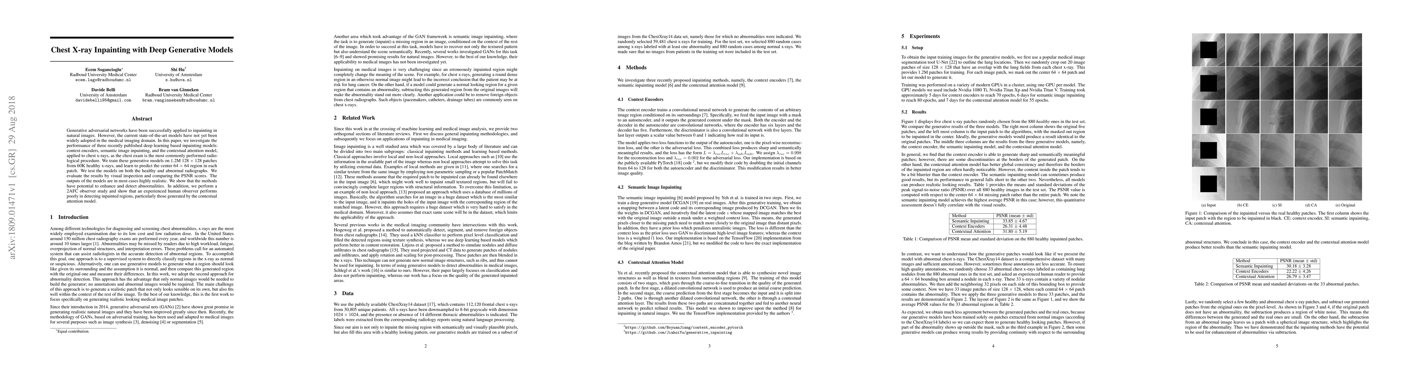 This paper explores the application of three deep learning inpainting models to chest X-ray images, demonstrating their potential to enhance and detect abnormalities. Results show highly realistic outputs, with an observer study indicating that even experts struggle to identify inpainted regions.