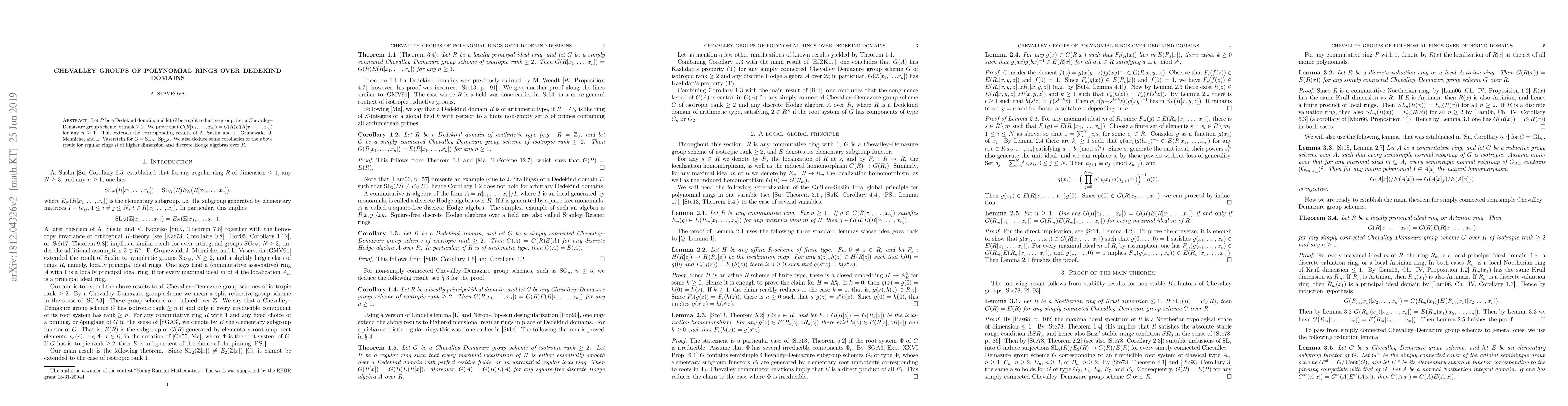 This paper proves that for a Dedekind domain R and a Chevalley group scheme G, the group of R-points in G over polynomial rings R[x_1,...,x_n] equals the product of G(R) and the group of units E(R[x_1,...,x_n]). This extends previous results for specific groups and provides corollaries for higher-dimensional regular rings and discrete Hodge algebras.