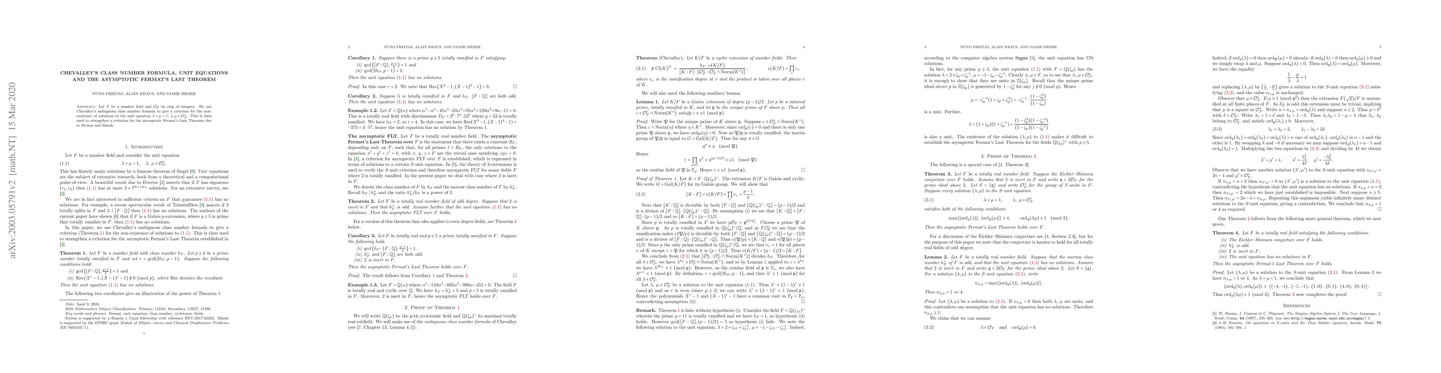 Summary: The paper employs Chevalley's ambiguous class number formula to establish a criterion for the non-existence of solutions to the unit equation in number fields, which subsequently strengthens Freitas and Siksek's criterion for the asymptotic Fermat's Last Theorem.