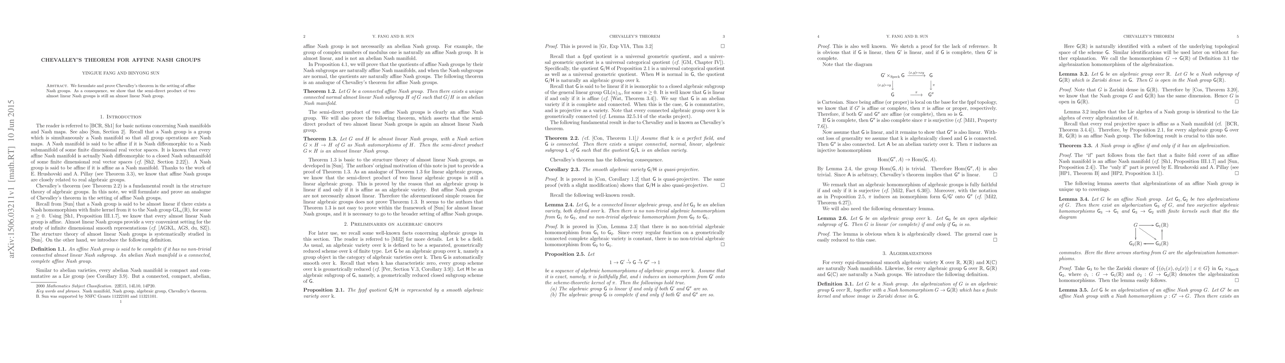 Chevalley's theorem is extended to the realm of affine Nash groups, demonstrating that the semi-direct product of two almost linear Nash groups remains an almost linear Nash group. This result reinforces the structure-preserving properties of these algebraic groups.