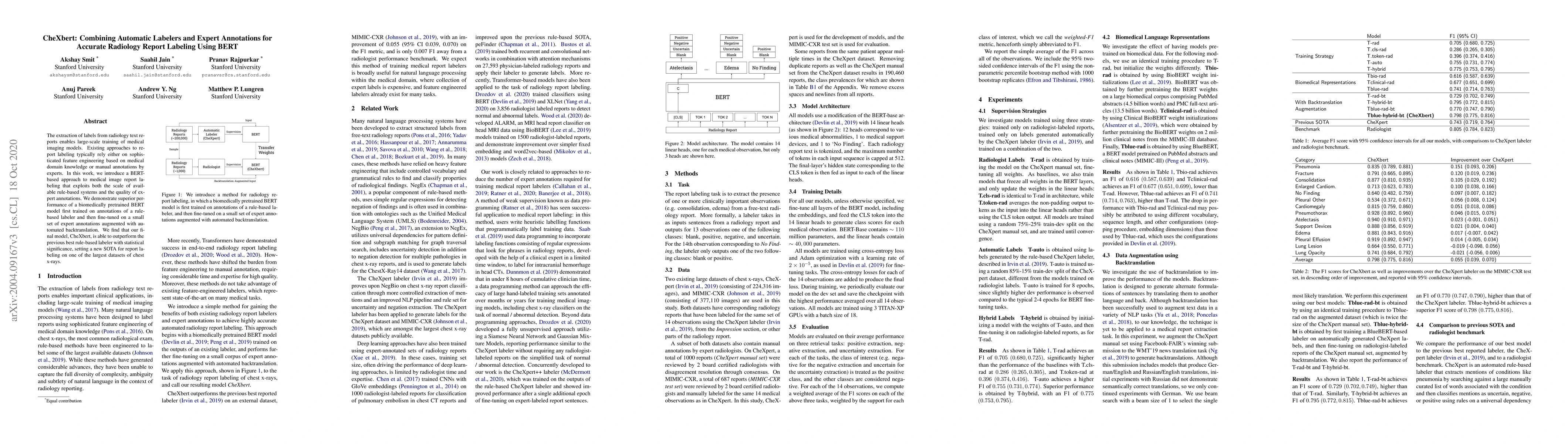 The extraction of labels from radiology text reports enables large-scale training of medical imaging models. Existing approaches to report labeling typically rely either on sophisticated feature engineering based on medical domain knowledge or manual annotations by experts. In this work, we introduce a BERT-based approach to medical image report labeling that exploits both the scale of available rule-based systems and the quality of expert annotations. We demonstrate superior performance of a biomedically pretrained BERT model first trained on annotations of a rule-based labeler and then finetuned on a small set of expert annotations augmented with automated backtranslation. We find that our final model, CheXbert, is able to outperform the previous best rules-based labeler with statistical significance, setting a new SOTA for report labeling on one of the largest datasets of chest x-rays.